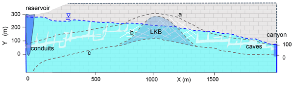 Dams and reservoirs in karst areas often struggle with significant leakage, making construction both challenging and costly. This study uses a numerical model to show how karst aquifers in water divide regions evolve to form low-karstified rock-blocks (LKB). It also explores how and when these LKBs can significantly reduce leakage across the water divides if a reservoir is built on one side.