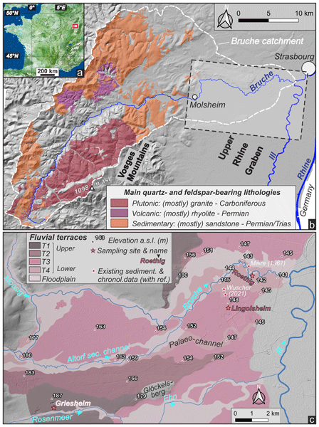 This study examines the evolution of the lower Bruche River valley in north-eastern France through its fluvial terraces, reflecting past river dynamics and environmental changes. Terrace formations are dated using luminescence to ~ 12–14 ka, ~ 27–35 ka, and at least 200 ka. Methodological improvements over conventional luminescence dating techniques are also discussed and refined in this study.
