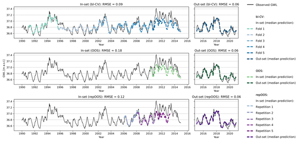 With the growing use of machine learning for groundwater level (GWL) prediction, proper performance estimation is crucial. This study compares three validation strategies—blocked cross-validation (bl-CV), repeated out-of-sample (repOOS), and out-of-sample (OOS)—for 1D-CNN and LSTM models using meteorological inputs. Results show that bl-CV offers the most reliable performance estimates, while OOS is the most uncertain, highlighting the need for careful method selection.