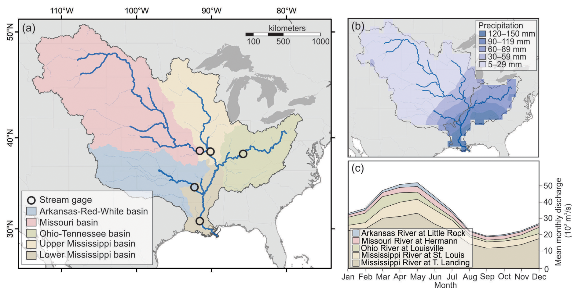 The Mississippi River Basin spans a range of hydroclimatic conditions. The western portion of the basin, including the Arkansas, Missouri, and Upper Mississippi basins, receives an average monthly precipitation of 5–59 mm. The eastern portion of the basin, including the Ohio-Tennessee and Lower Mississippi, receives 60–150 mm per month. The subbasins are divided along the median range of precipitation values (∼60 mm per month), which most closely follows a set of sub-basin boundaries (Fig. 1b). The Entire Mississippi basin can also be categorized into subbasins by other hydroclimate variables, including temperature, actual evapotranspiration, and runoff; when categorized by these variables, similar subbasin groupings emerge to those produced by precipitation patterns (Mccabe and Wolock, 2019). While the basin can be divided and grouped at different scales, we refer to it as the Eastern Mississippi basin (Ohio-Tennessee and Lower Mississippi), Western Mississippi basin (Arkansas, Missouri, and Upper Mississippi basins) and entire Mississippi basin in subsequent sections of the discussion given similar precipitation and hydroclimate characteristics (Fig. 1).