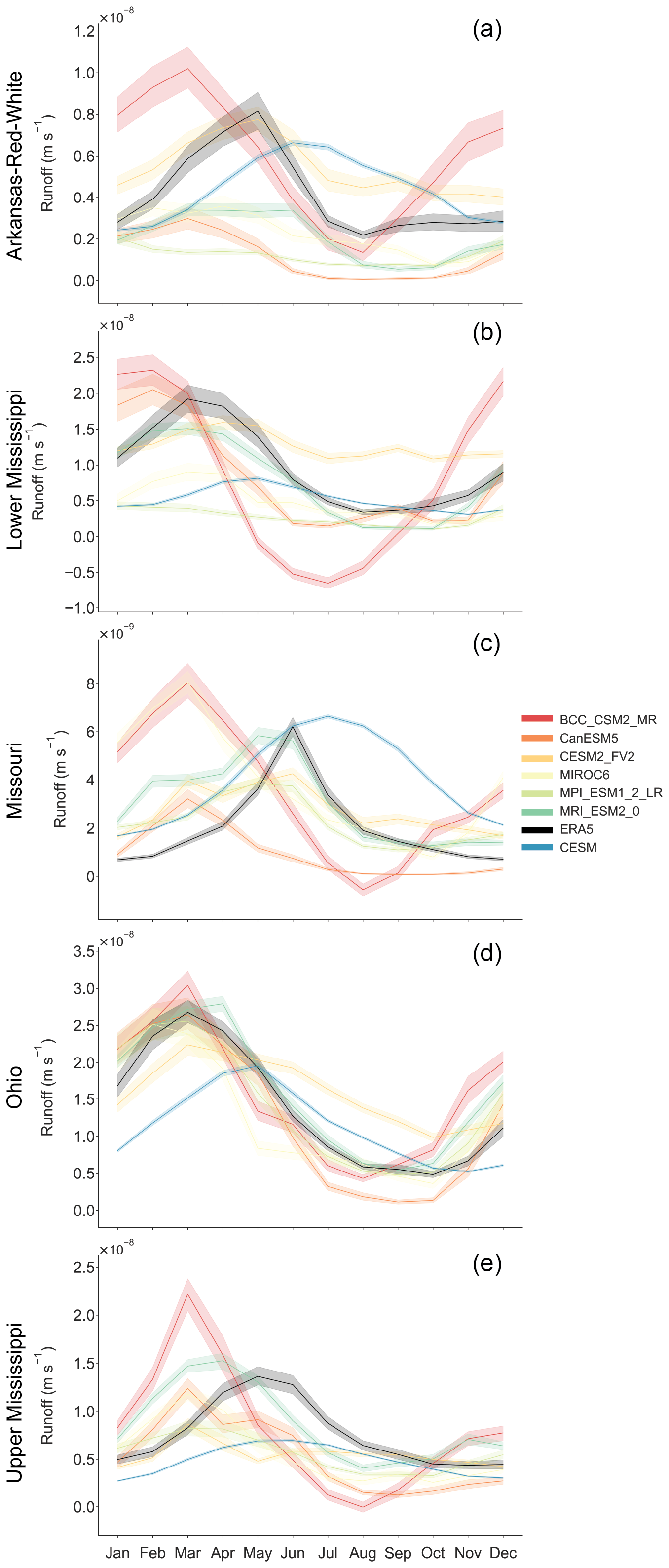 Figure A4Monthly mean simulated runoff (m s−1) from selected CMIP6 models (BCC CSM2 MR [red], CanESM5 [dark orange], CEMS2 [light orange], MIROC6 [yellow], MPI ESM1 2 LR [light green], MRI ESM2 0 [dark green]), CESM1 [blue], and ERA5 reanalysis [black] for the Arkansas-Red-White (a), Lower Mississippi (b), Missouri (c), Ohio (d), and Upper Mississippi (e) basins. Shading represents a 95 % confidence interval from interannual variability.
