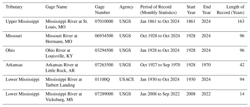 Table 1Gage Statistics for gages used in analysis, including USGS gages Mississippi River at St. Louis, MO, Missouri River at Hermann, MO, Ohio River at Louisville, KY, Arkansas River at Little Rock, AR, and Mississippi River at Vicksburg, MS (U.S. Geological Survey, 2016a, b, c, d, e) and USACE gage Mississippi River at Tarbert Landing, (US Army Corps of Engineers, 2025).