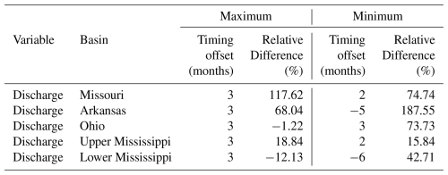 Table A1Timing offset and relative difference values for hydroclimate variables between simulated (CESM1) and reanalysis data (ERA5 for temperature, surface runoff, subsurface runoff, total runoff, soil moisture, and snowmelt; GPCC for precipitation; Livneh for evapotranspiration) for maximum and minimum values for all subbasins (Arkansas-Red-White, Lower Mississippi, Missouri, Ohio, and Upper Mississippi). Timing offset is in months, where positive values indicate simulated values are delayed relative to reanalysis, and negative values indicate simulated values are early relative reanalysis. Relative difference values are a percent, and positive values indicate that simulated values are larger, while negative values indicate that simulated values are smaller than reanalysis values.