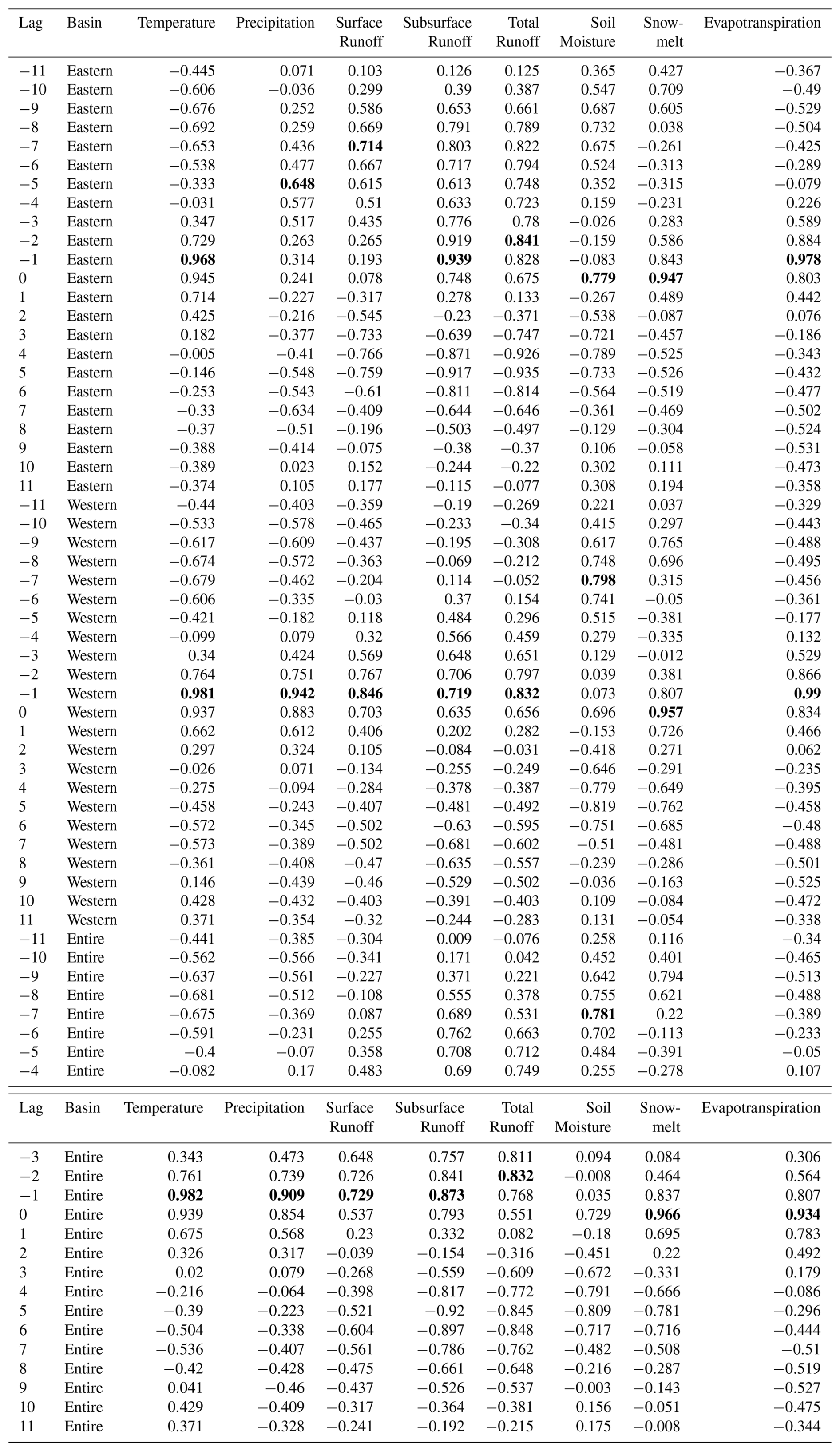 Table A2Lag Correlation values for each variable in the Eastern, Western, and Entire Mississippi Basin at each lag. Maximum correlation values are bolded.