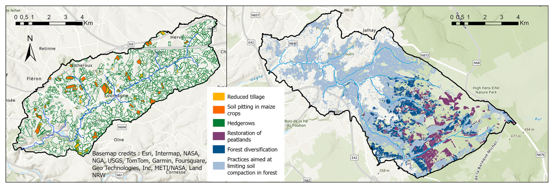 In other land uses such as agricultural, this consideration might not be true and might require spatially distributed, physically based hydrological modelling approaches, able to rank the most effective NbS–location combinations in a given context (Brauman et al., 2022). Indeed, these types of models enable the virtual implementation of a set of NbSs at the catchment scale with a specific spatial arrangement. Water fluxes, calculated on a variable-resolution grid, are derived from physically meaningful equations that rely on physically meaningful local parameters that can be measured (topography, geology, soil hydraulic properties, surface roughness and vegetation). These factors influence small-scale (grid-cell-scale) hydrological processes, such as infiltration. Through the spatial and temporal adjustment of these parameters, scenarios of NbSs can be represented. Thus, the physical response (and effectiveness) of an intervention implemented at a specific location that might affect the global catchment's behaviour can be modelled.