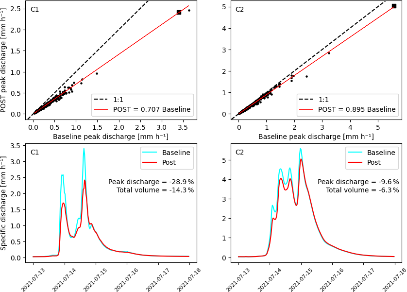 Peak flow percent reduction – the evolution of peak discharges between the BASELINE and the POST scenarios.