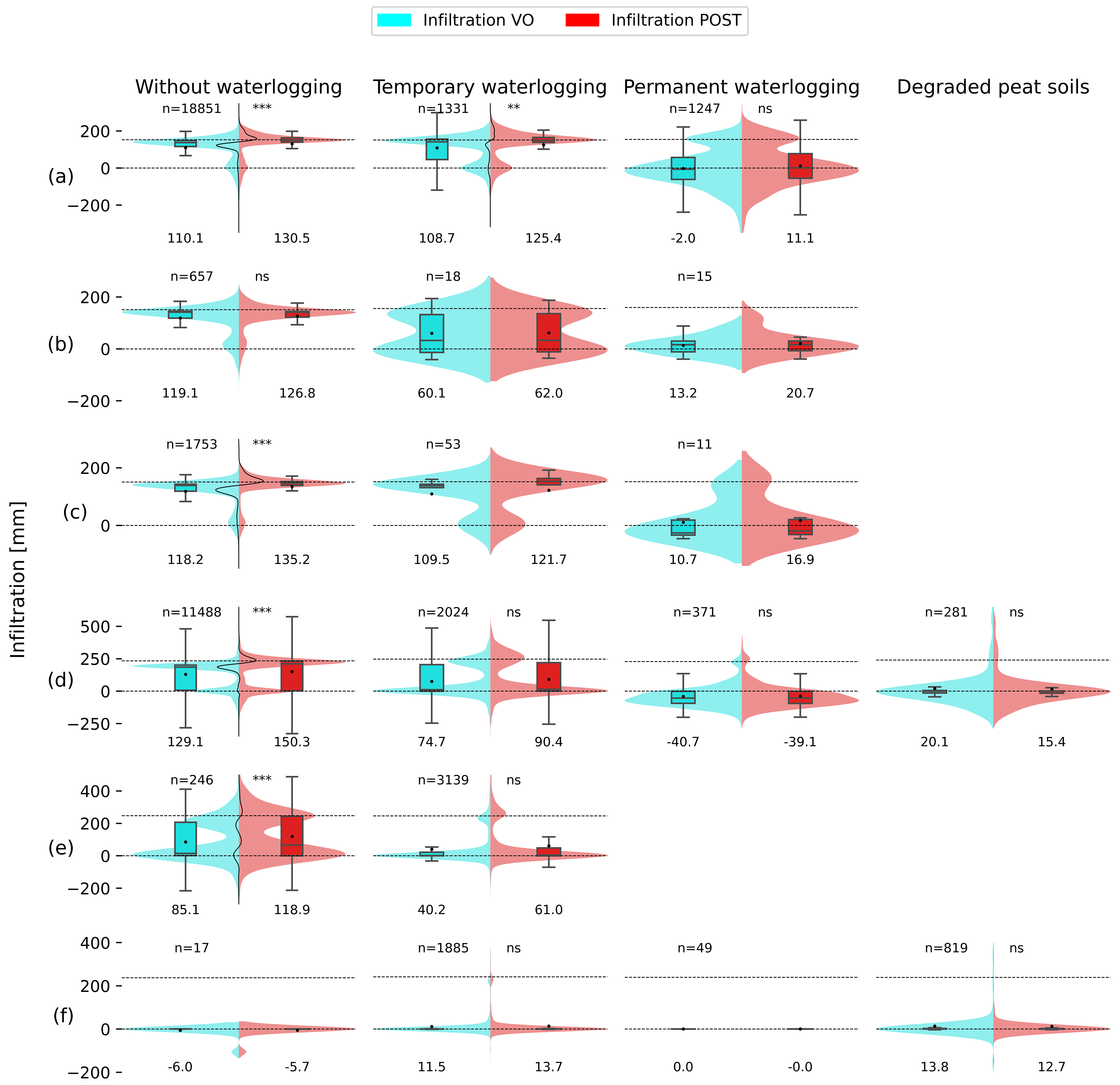 The modelled dynamics of the saturated zone depth agreed well with the expected dynamics for each drainage class on the Belgian soil map (Fig. 4). The range of variation, as well as the frequencies of the modelled saturated zone depths, were slightly higher in the degraded peat soils compared with the intact peat (Wastiaux, 2008). Soils designated as “without waterlogging” on the soil map were seldom, if ever, subject to waterlogging. In most grid cells, the modelled saturated zone remained well below the surface, with few exceptions in late winter. As expected in temporarily waterlogged soils, the modelled saturated zone often reached the surface during the winter months and receded during the summer. Overall, the model successfully represents the variability in the natural drainage characteristics of soils in the BASELINE scenario, thus addressing our first objective, which was a prerequisite for assessing the effectiveness of the NbS measures on various soils with differing natural drainage characteristics.