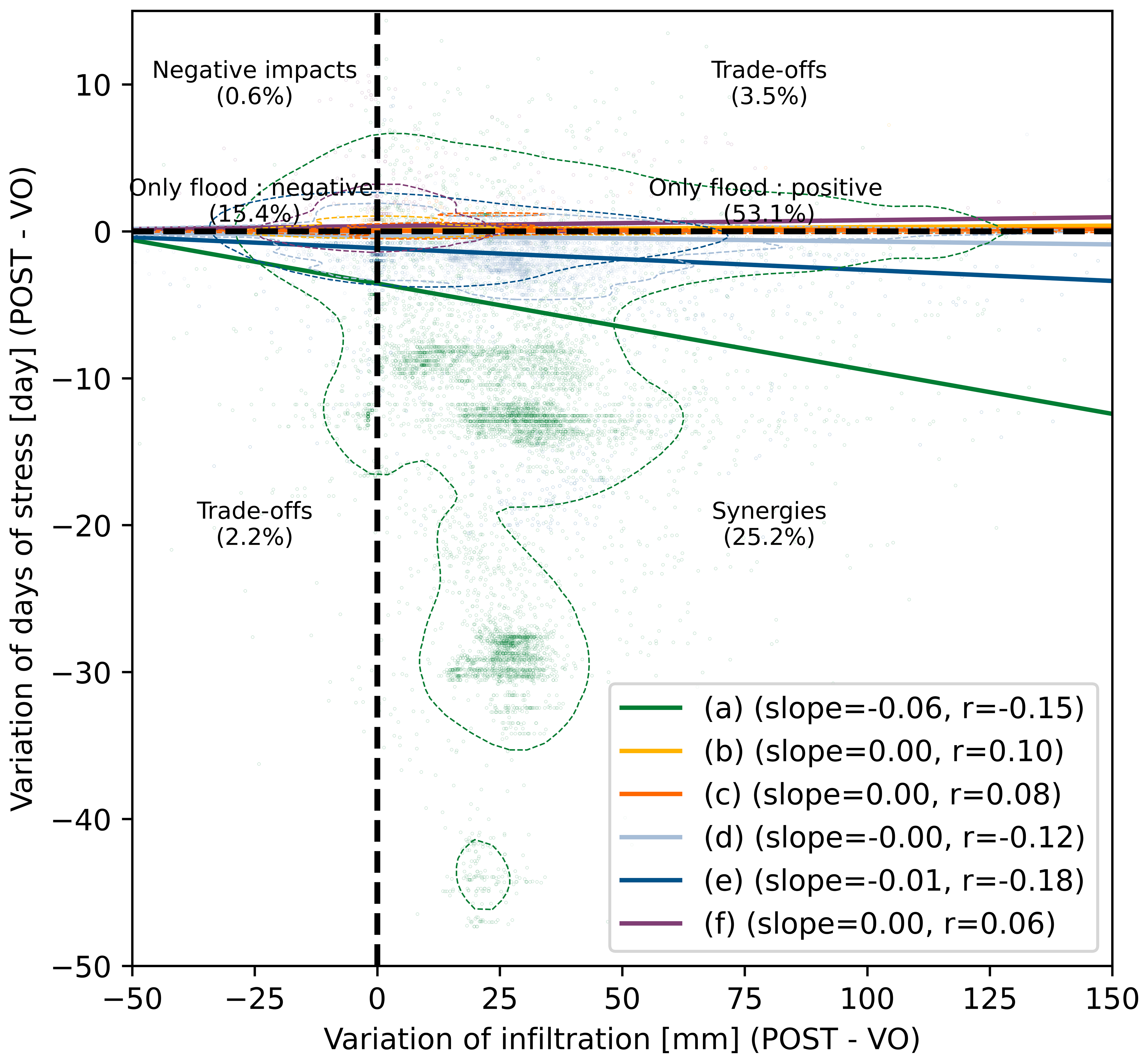 Spatial vegetation drought stress duration frequency: this is an indicator to assess the effect of NbSs on vegetation water stress was (newly) developed, utilizing a frequency analysis. Consecutive days where plants at specific locations underwent water stress beyond a designated threshold against a return period were mapped. Thresholds were determined based on the soil water potential within the root zone. An extreme stress threshold was defined when the water potential in the root zone drops below 150 m (-1.5 MPa), closely approaching the permanent wilting point, which is classically recognized by soil scientists as the soil water potential beyond which most plants cannot survive (Wiecheteck et al., 2020). Additionally, a moderate stress threshold for vegetation was established at a water potential of 30 m (-0.3 MPa), corresponding in our study sites to approximately 30 % of the relative extractable water content in soil (Gourlez de la Motte et al., 2020; Granier et al., 2007). The methodology to construct this indicator is briefly described as follows: for each cell of the model and for each year (2004–2021), the maximum consecutive duration during which the water potential in the soil profile explored by the roots (rhizosphere) was below the stress threshold was extracted. Then, for each cell, a Gumbel distribution was used to establish the relationship between the duration (y) and the probability of occurrence (return period: TM) of the stress.