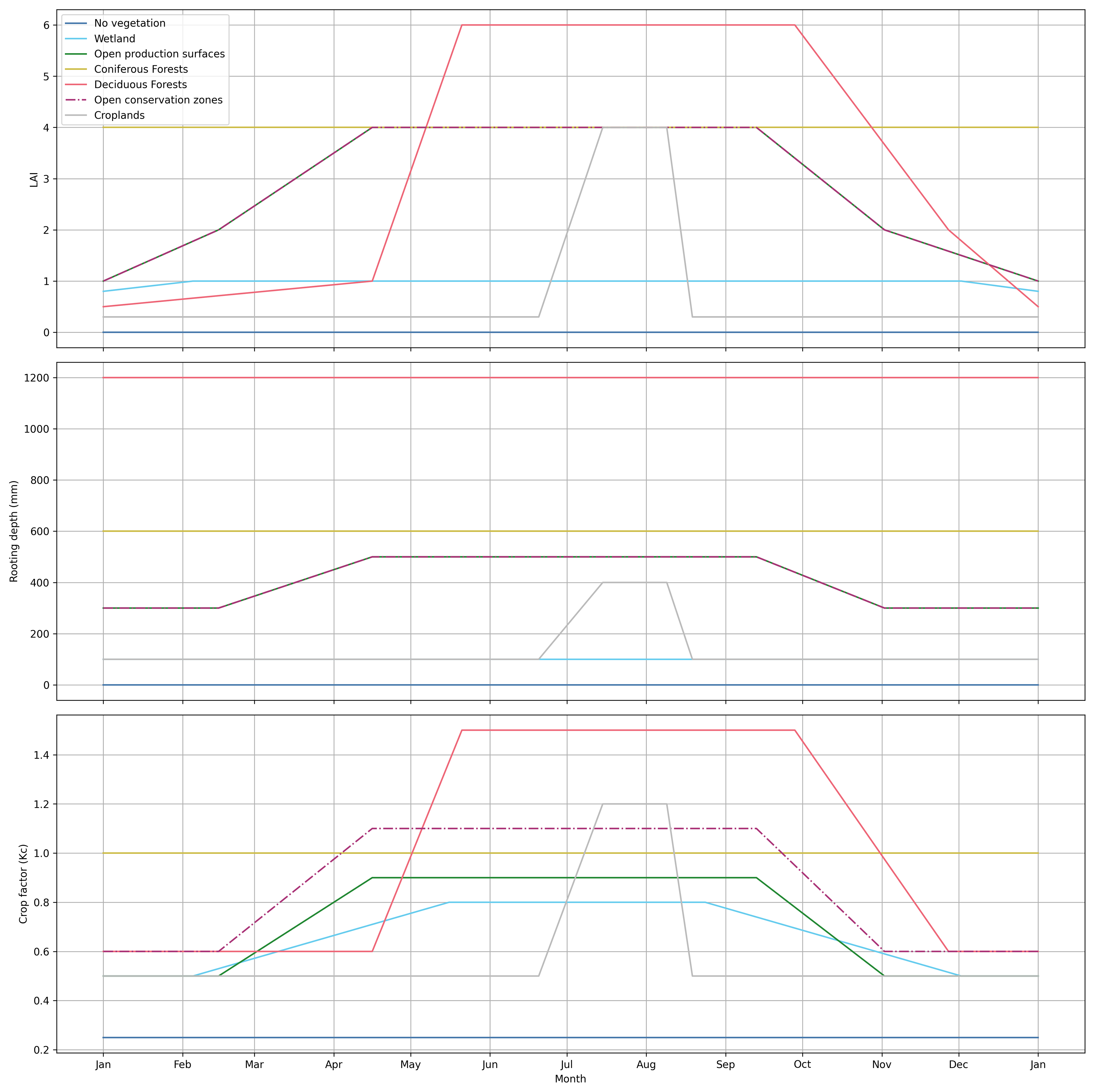 The surfaces were also categorized into seven vegetation classes based on the LULC map. Apart from permanent grasslands, which were considered open production surfaces, most croplands were cultivated with maize. Consequently, maize development dynamics were assigned to all croplands, and in the absence of information on cropping practices, no crop rotations were modelled. Each vegetation class was assigned annual dynamics (temporally varying) of the leaf area index (LAI), crop coefficient factor (Kc) and root depth (Rd) (Appendix Fig. A1). These parameters are used by the model to refine the reference evapotranspiration (Penman–Monteith) into the actual evapotranspiration following the approach of Kristensen and Jensen (DHI, 2024). In addition, detention storage, which is a parameter aimed at accounting for ponding in depressions at sub-cell scale, was fixed at 4 mm in both catchments.
