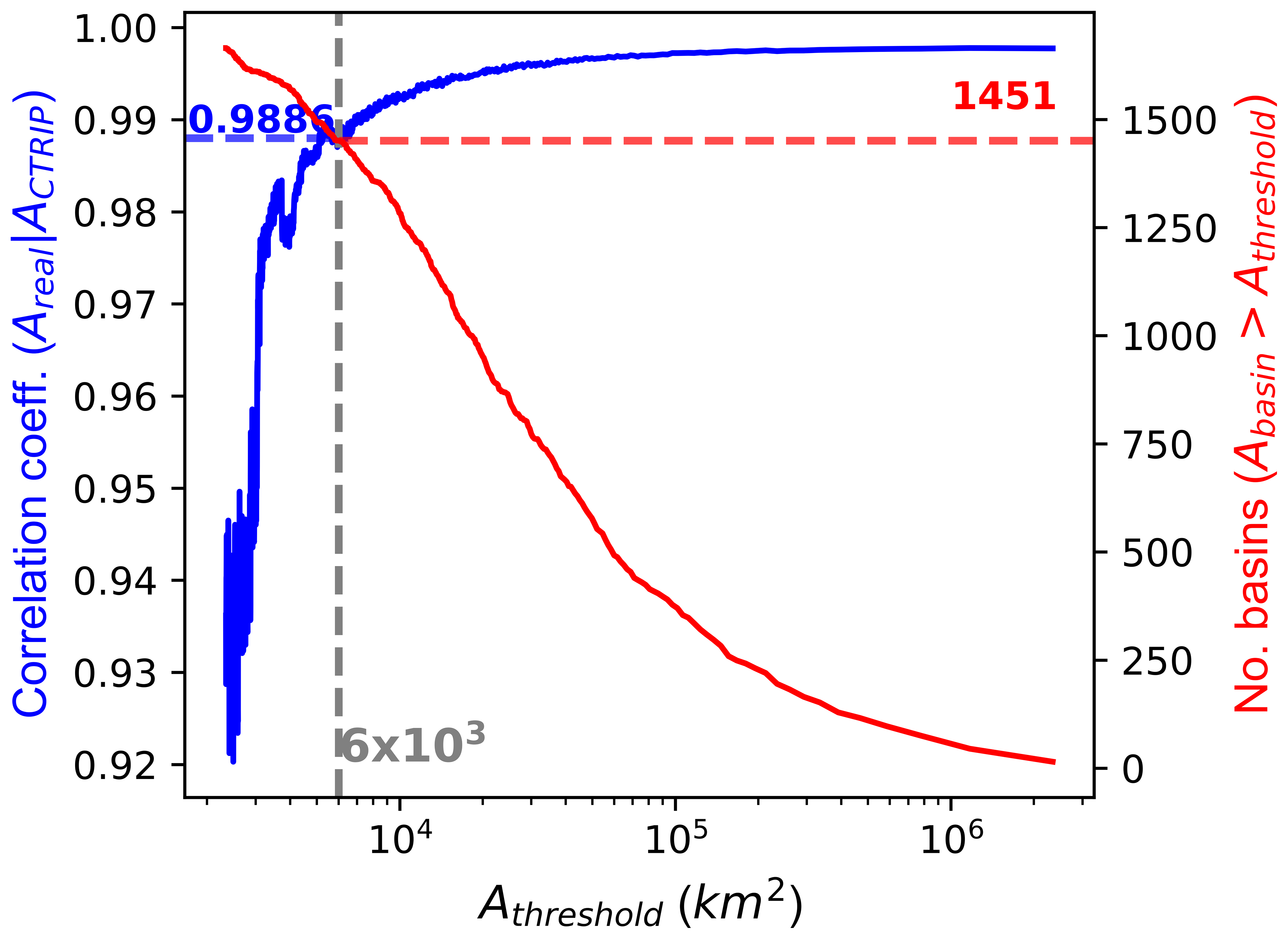 We conducted a correlation analysis to select the minimum drainage area considered in the study. For basins with an area higher than a certain threshold (Athreshold), Fig. 2 shows the correlation between the basin area (Abasin) and the area estimated for the CTRIP routing model (ACTRIP). With increasing Athreshold, the correlation increases, but the number of available basins is reduced. The threshold is set to 6×103 km2 (about two CTRIP cells per basin in mid-latitudes) to maintain a balance between the number of basins analysed and their geometrical representation and to avoid considering basins inside the spurious oscillating correlation curve (Fig. 2). There are 1451 gauged basins with Abasin≥Athreshold, with an Abasin|ACTRIP correlation of 0.9886.