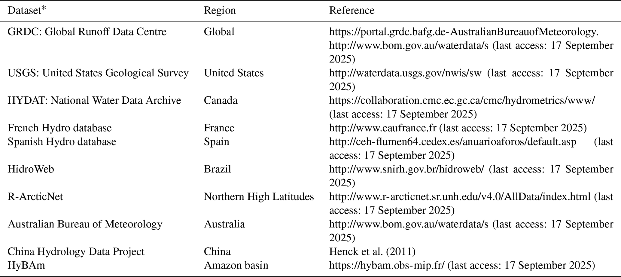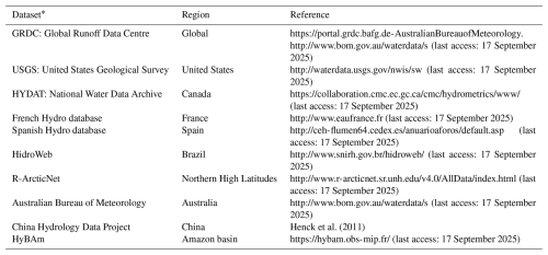Most previous works evaluate the “potential” streamflow predictability of a forecast system by adopting the perfect-model assumption, in which the streamflow forecast is compared to simulated streamflow (from a model driven by meteorological observations) instead of observed streamflow. Here, we compare the forecasts against observations because, in addition to the IHC and FSC, these incorporate the uncertainty associated with model error (due to structure, physics, and parameter uncertainty) and provides actual (as opposed to potential) streamflow predictability, which is more valuable for end-users or the development of climate services. A database of 1755 flow gauge stations has been created, compiling the global streamflow open-access datasets presented in Table 2. We have filtered the full dataset to remove stations with relatively small drainage areas poorly represented by the model resolution and those stations with more than 25 % of missing streamflow records in the season of concern.