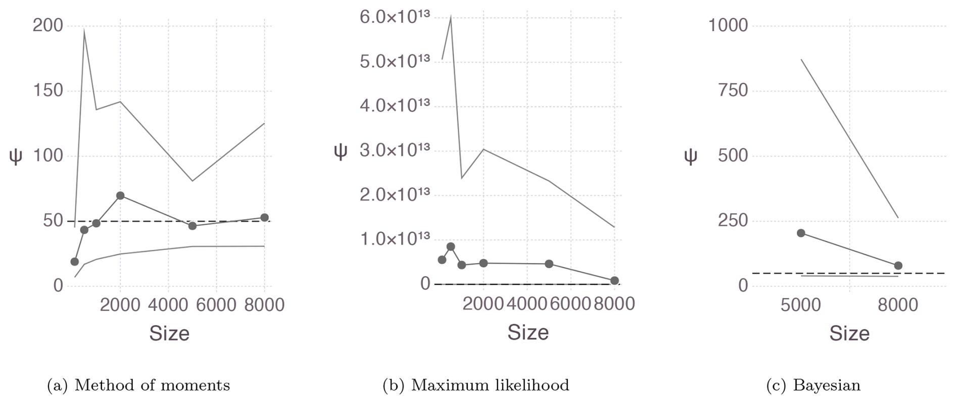 Figure 3Mean and 95 % empirical confidence interval for the ψ estimates of the 100 very large samples of the distribution obtained with (a) the method of moments, (b) the maximum likelihood, and (c) the Bayesian method using Gibbs sampling.