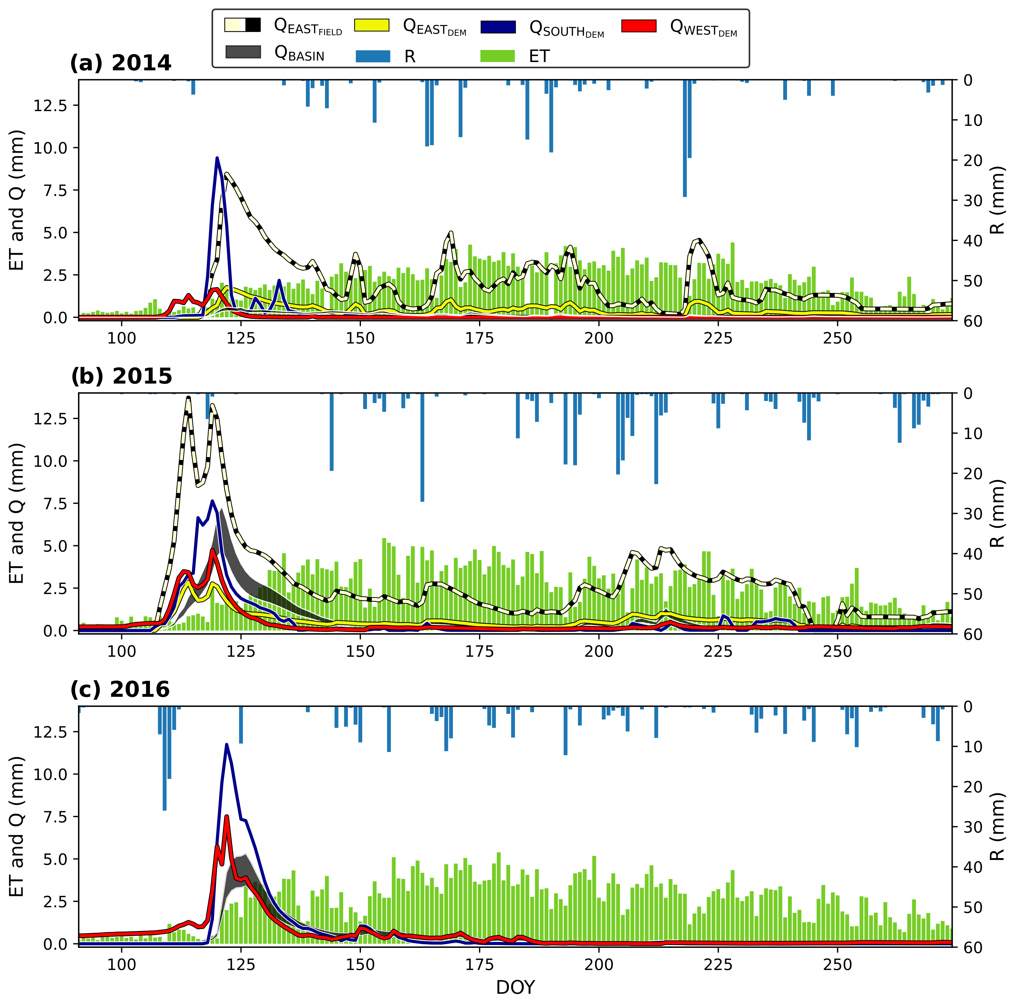 Figure 2Basin and sub-basin hydrographs in (a) 2014, (b) 2015 and (c) 2016 – daily rainfall (REAST=RSOUTH=RWEST, mm d−1), boreal peatland complex evapotranspiration (ETLAND) approximately corresponding to ET from the West sub-basin (ETLAND≈ETWEST, mm d−1), runoff (Q, mm d−1) from the Scotty Creek basin, and Q (mm d−1) from the East, South, and West sub-basins approximately draining the landscape flux tower footprint area (Fig. 1c). EastDEM and EastFIELD drainage areas are used to compute the lower and upper Q range contours (DOY = day-of-year).