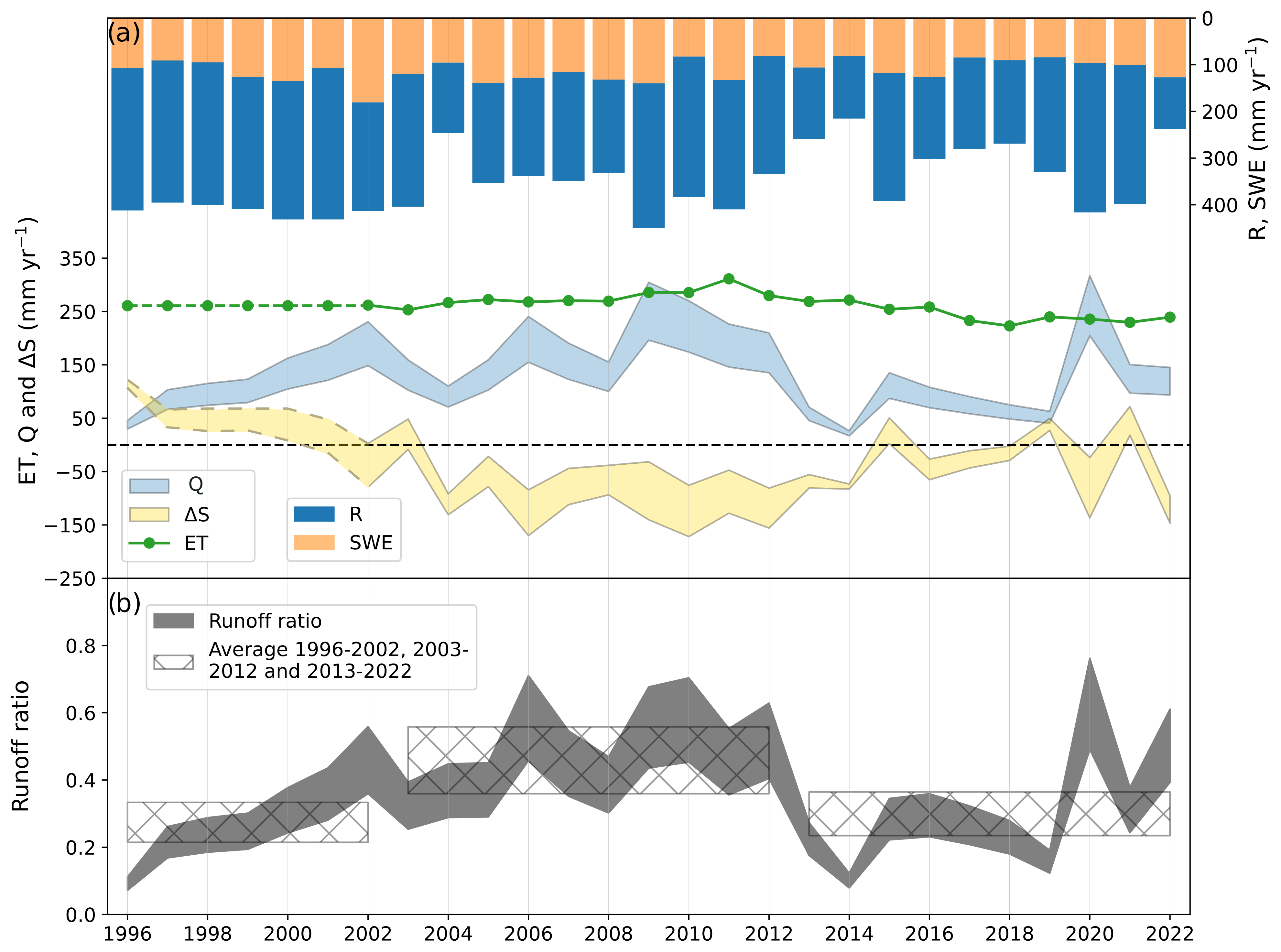 Figure 6(a) Annual (hydrological year: October–September, 1996–2022) water balances (mm yr−1) for the Scotty Creek basin obtained from daily precipitation (PBASIN) and rainfall measurements (RBASIN) resulting in snow water equivalent (SWEBASIN=PBASIN-RBASIN), daily runoff (QBASIN) and evapotranspiration (ET) estimates from the BESS model (ETBESS_BASIN). ET for the 1996–2001 period (dashed green line) corresponds to the 2002–2022 average period. Basin scale water storage change (ΔSBASIN) is the difference between incoming and outgoing water fluxes. (b) Annual ratio of runoff to precipitation (i.e. the runoff ratio). The hashed area corresponds to the mean runoff ratio over the temporal period considered (1996–2002; 2003–2012; 2013–2022). For panels (a) and (b), the range of values for QBASIN, ΔSBASIN and the runoff ratio corresponds to the lowest and highest basin drainage area estimates, i.e. 130 and 202 km2.
