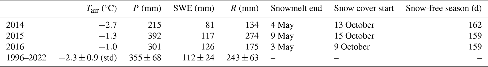 Table 1Annual mean air temperature (Tair), total precipitation (P), snow water equivalent (SWE) and rain (R) at Fort Simpson (data from the Fort Simpson climate station, WMO ID: 71365, were gap-filled with data from the Fort Simpson A station, WMO ID: 71946, Environment and Climate Change Canada, https://climate.weather.gc.ca, last access: 31 May 2024), dates of snowmelt end and start of a spatially continuous snow cover and snow-free season length at Scotty Creek.