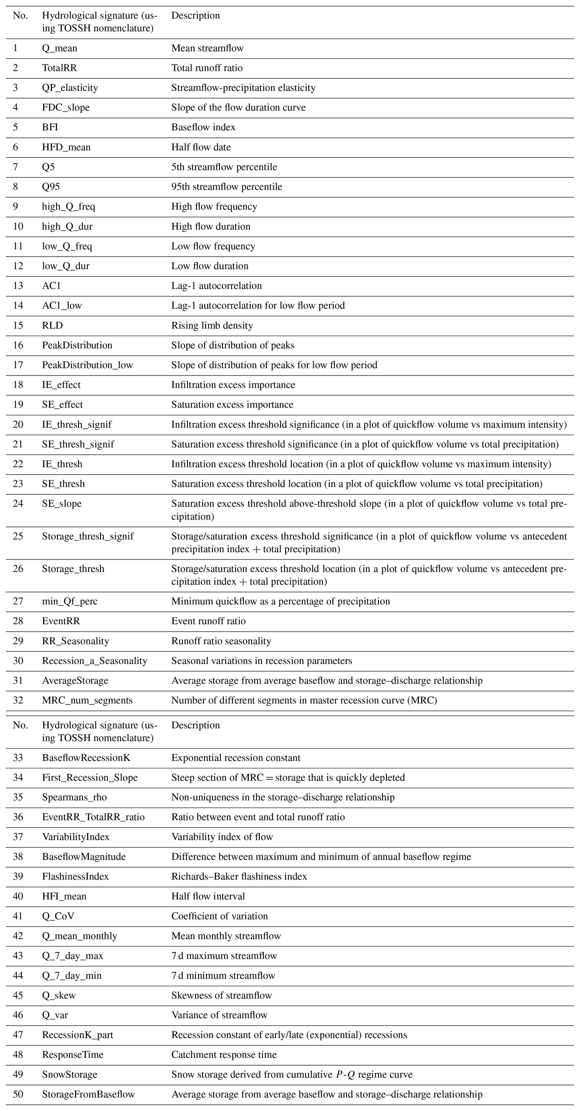 Table 1Fifty hydrological signatures computed with the Toolbox for Streamflow Signatures in Hydrology (TOSSH). The computed hydrological signatures follow TOSSH nomenclature (e.g. TotalRR is the total runoff ratio). A description of the signatures is also included.