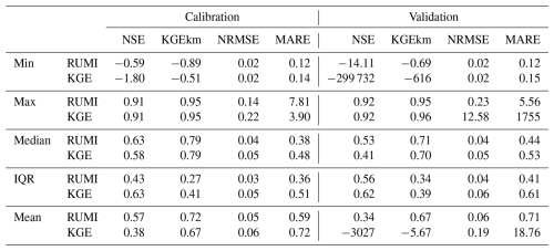 Remarkably, the RUMI-based simulations outperform the KGE-based ones in both calibration and validation and for the four performance metrics analysed. The latter is in terms of variability (e.g. the interquartile range – IQR), median of boxplots, and number of outliers for both the calibration and validation periods. Table 2 summarises the four considered performance metrics in terms of (a) calibration and validation; (b) RUMI and KGE; and (c) minimum, maximum, median, IQR, and mean values.