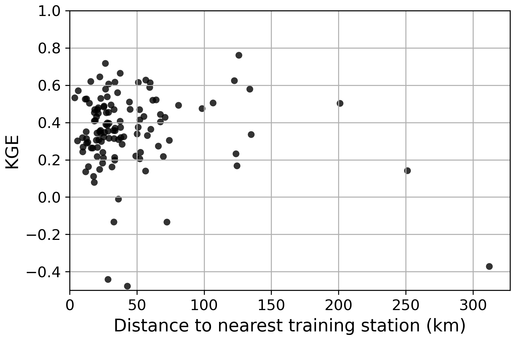 A key potential limitation of ML-based P estimation is poor generalizability; models often fail in regions lacking training data (Xu et al., 2024). To assess whether this applies to our models, we analyzed KGE values of the evaluation stations as a function of distance to the nearest training station (Fig. 5). The results show no clear decline in KGE with increasing distance, indicating satisfactory spatial generalizability. Another potential limitation is the “black-box” nature of ML models, which limits interpretability. To improve transparency, we computed predictor importance for all four submodels of model_01 (Table 6). IMERG-L V07 consistently ranked higher than GSMaP-MVK V8 in importance, indicating a preference for IMERG, in agreement with its superior validation performance (Table 4). ERA5 was the most important predictor for the daily submodel (Submodel 1), whereas IMERG dominated in the 3-hourly and hourly submodels (Submodels 2 and 4, respectively). This likely reflects the ability of observational satellite-based datasets like IMERG to capture event timing more accurately. This also demonstrates the ability of the models to exploit the complementary strengths of the different P predictors. Static predictors were overall much less important than dynamic ones. Among the static predictors, Lon, Lat, and AbsLat had the highest importance, accounting for regional variability in P predictor performance and error characteristics.