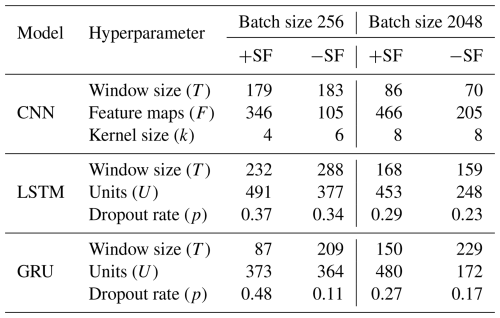 The batch size has no physical interpretation in the context of hydrological processes but functions as a crucial hyperparameter in the training of neural networks. Prior studies, such as that of Kratzert et al. (2019a, b), have demonstrated the successful application of a batch size of 256. In this study, this batch size was also adopted and served as the baseline. To further explore the impact of larger batch sizes, a multiple of 256 was employed. A batch size of 2048 was then utilised, representing the upper limit of the memory capacity of the graphics card used.