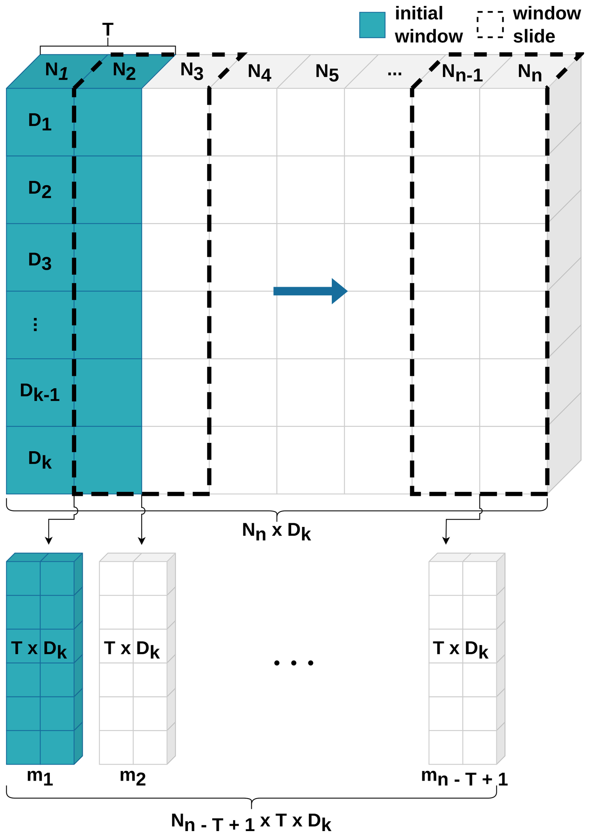 Figure 2Schematic procedure of data transformation by applying a moving window: this procedure primarily involves the partitioning of the data into distinct sections, employing a window (blue) that slides across the dataset, effectively creating a temporal snapshot (m). T delineates the window size within the temporal dimension, D represents the feature dimension, and N signifies the temporal samples with a daily resolution.