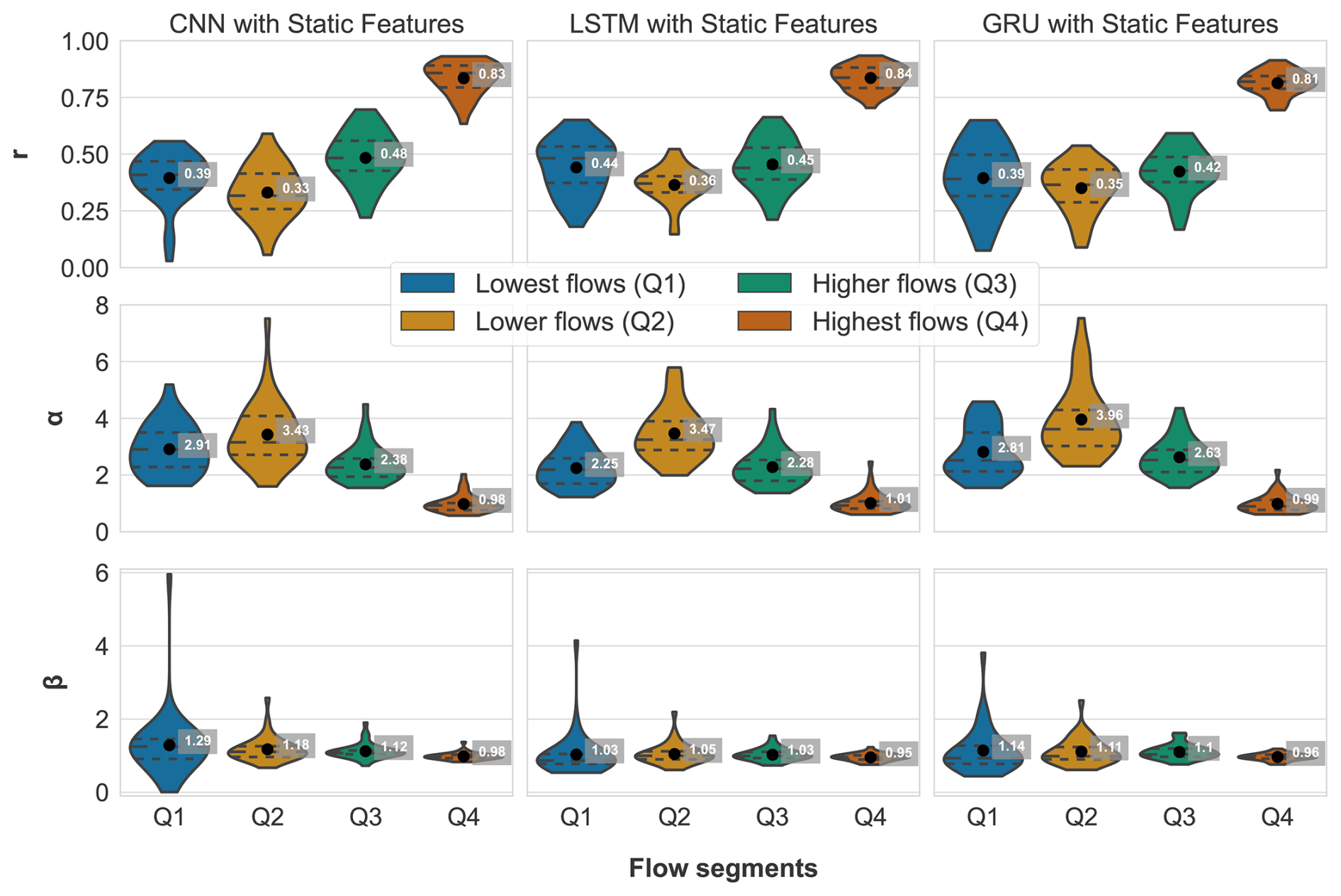 Notably, the CNN and LSTM models, when configured with a batch size of 256 and incorporating static features, achieved the highest NSE (Eq. 3) values of 0.76 and 0.75, respectively. In comparison, the GRU model under identical configurations exhibited a slightly inferior performance, marked by an NSE of 0.72. In the context of existing literature, Nguyen et al. (2023a) reported an NSE of 0.66 for an LSTM model calibrated across three distinct catchments, each with its own separate calibration and not extending to ungauged scenarios.
