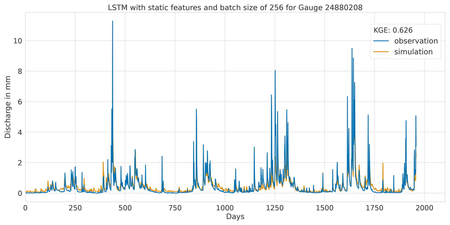 The CNN model with static features and a batch size of 256 showed the highest mean KGE and therefore outperforms LSTM and GRU models slightly.