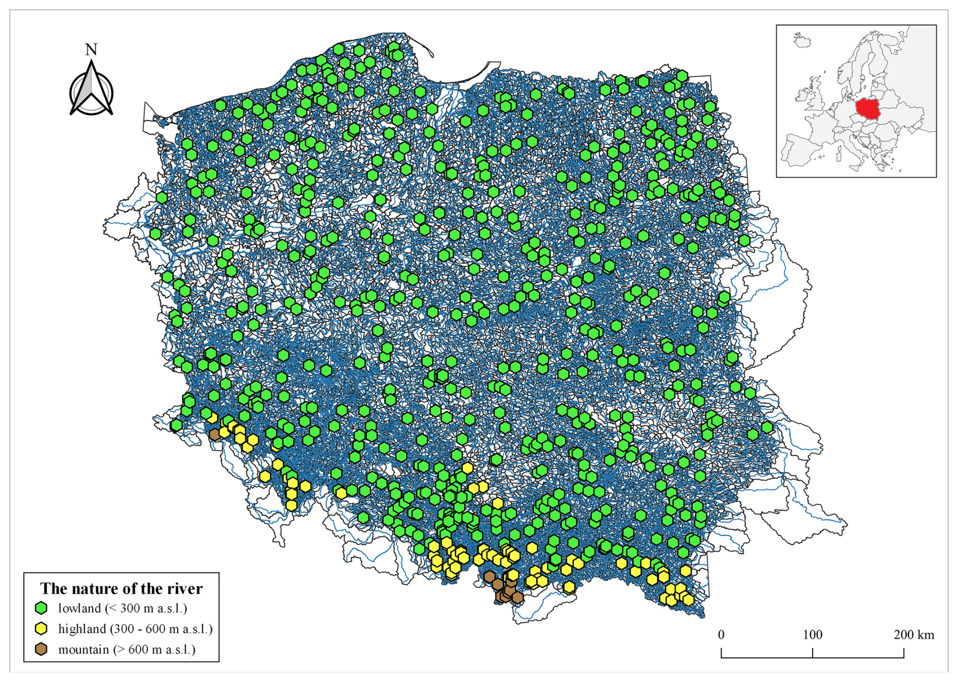 Figure 2Terrain characteristics of the 678 stream gauge profiles analyzed consist of lowlands, highlands, and mountains (source: hydrographic map of Poland).