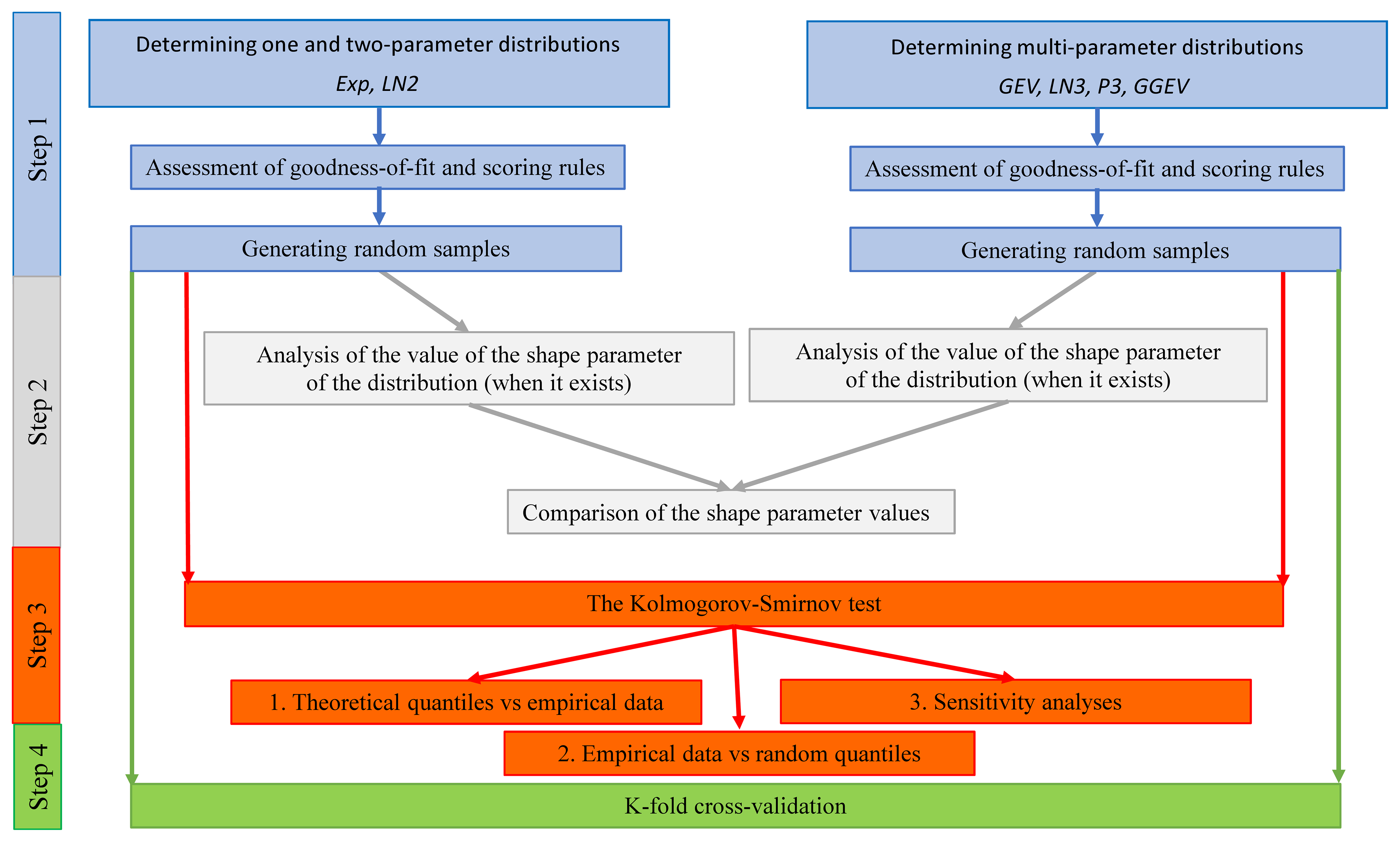 The methods for determining the Exp and LN2 distributions and their goodness-of-fit assessment are presented in Sects. S1 and S2 in the Supplement. The generation of random samples for the Exp, LN2, GEV, and GGEV distributions is described in Sect. S3 in the Supplement.