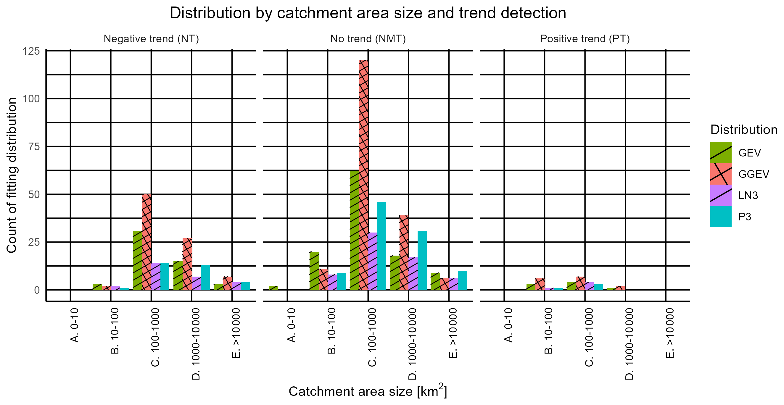 The probability distributions determined for the NMT samples show a relationship between A and Qp, represented by a simple regression line (Fig. 6, Table S3). The widest range of A is characterized by the samples for which the P3 distribution (30–20 000 km2) and the GEV distribution (3.5–170 000 km2) provide the best fits, while LN3 (35–110 000 km2) and GGEV (50–70 000 km2) fit more limited ranges. Moreover, the widest range of Qp is characterized by the samples for which the P3 (1.9–7000 m3 s−1) and GEV (1.6–7000 m3 s−1) distributions fit best, suggesting that these distributions are the most flexible in modeling extreme flows for different basin sizes. In contrast, the LN3 (8.5 to 6.500 m3 s−1) and GGEV (2 to 6000 m3 s−1) distributions show a more limited applicability (Fig. 6, Table S3). Since this may appear to contradict the results presented in the previous sections, a similar analysis is carried out below but separately for each trend category.