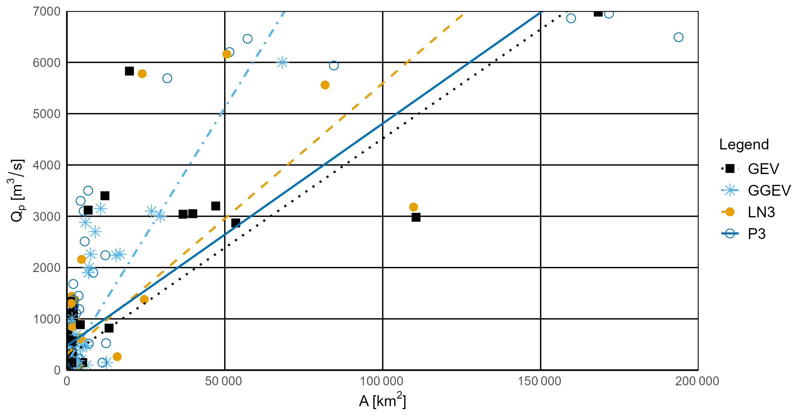 Next, it was checked whether the relationship between the catchment area (A) and the registered maximum peak flow (Qp) could influence the choice of distribution.