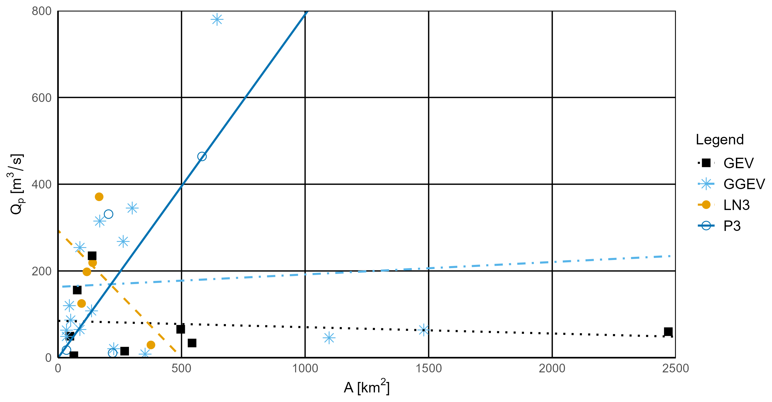 Figure 8Relationship between the catchment area (A) and the peak flow magnitude (Qp) for observational series with a positive trend and for the four fitting probability distributions (P3, LN3, GEV, and GGEV).