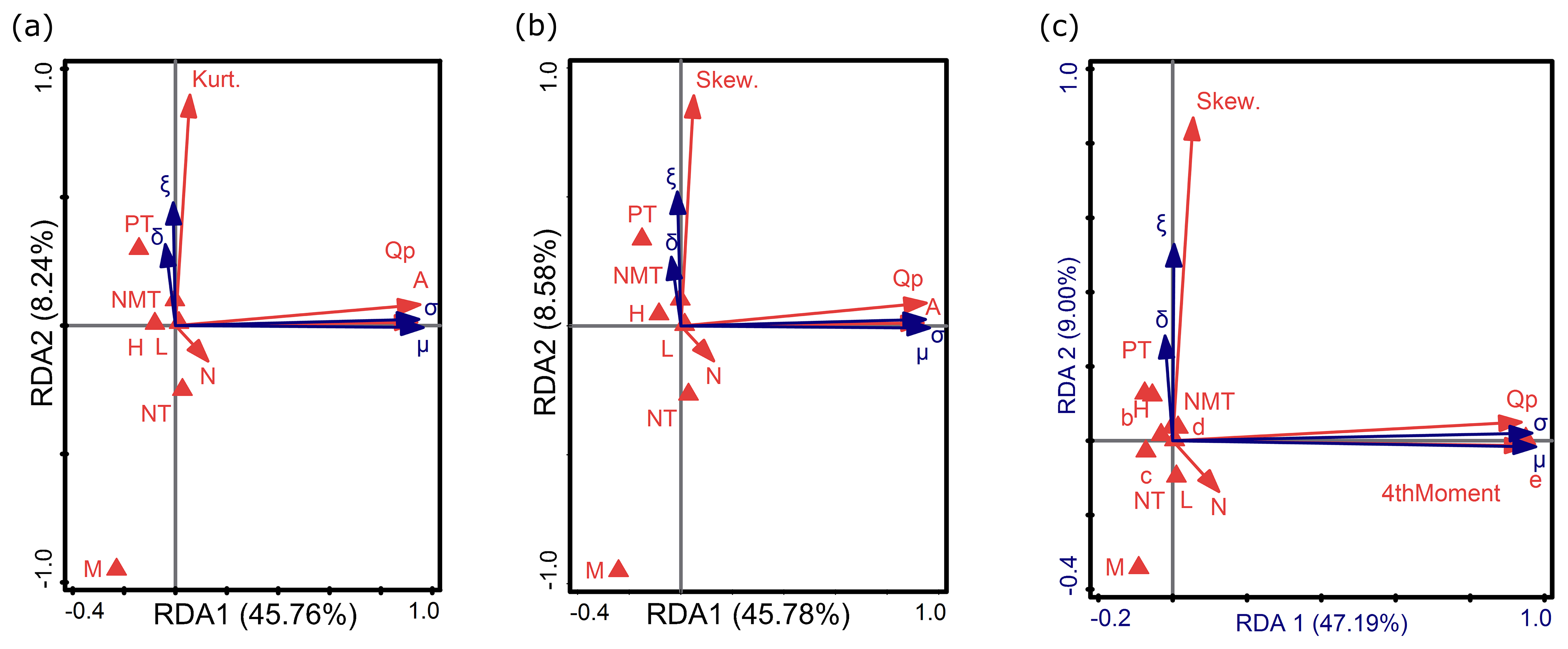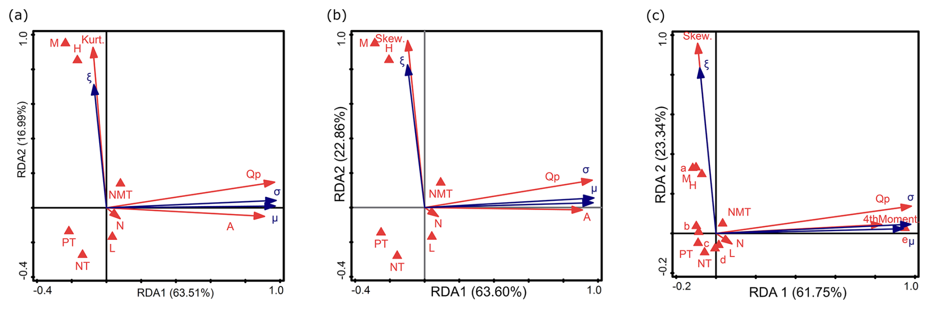 Figure 9RDA results of the relationship between environmental factors, sample characteristics, and the parameters of GEV (σ, ξ, μ), distinguishing between (a) kurtosis instead of skewness, (b) skewness instead of kurtosis, and (c) catchment area ranges instead of variable A and the fourth moment. Descriptions of symbols: μ – location parameter; σ – scale parameter; ξ – shape parameter. Catchment area ranges (in km2): a – A<10; b – ; c – ; d – ; e – A>10 000. Flow peak: Qp. Trend: NMT is no trend, PT is positive trend, and NT is negative trend. Nature of the watercourse: L – lowlands; H – highlands; M – mountains. Parameters of the empirical sample: Skew. is empirical skewness, Kurt. is empirical kurtosis, and 4thMoment is the fourth-moment center. N: sample size.