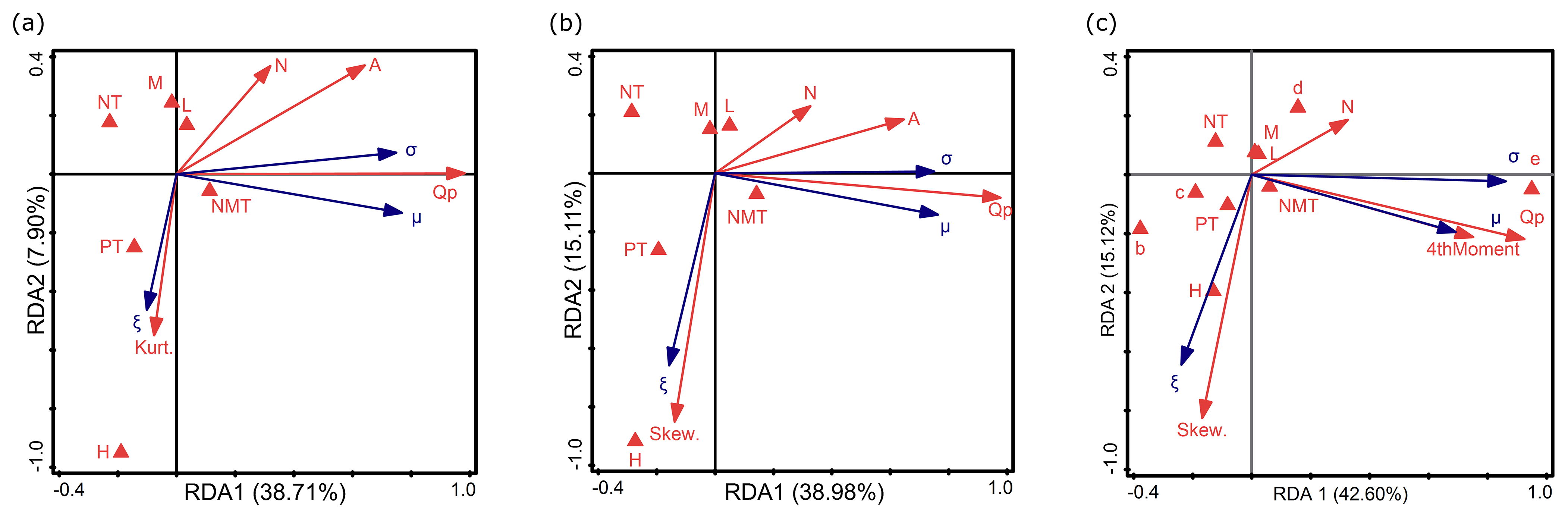 Figure 10RDA results of the relationship between environmental factors, sample characteristics, and the parameters of GGEV (σ, ξ, δ, μ), distinguishing between (a) kurtosis instead of skewness, (b) skewness instead of kurtosis, and (c) catchment area ranges instead of variable A and the fourth moment. Descriptions of symbols: μ – location parameter; σ – scale parameter; ξ – shape parameter; δ – shape parameter of GGEV extension. Catchment area ranges (in km2): a – A<10; b – ; c – ; d – ; e – A>10 000. Flow peak: Qp. Trend: NMT is no trend, PT is positive trend, and NT is negative trend. Nature of the watercourse: L – lowlands; H – highlands; M – mountains. Parameters of the empirical sample: Skew. is empirical skewness, Kurt. is empirical kurtosis, and 4thMoment is the fourth-moment center. N: sample size.