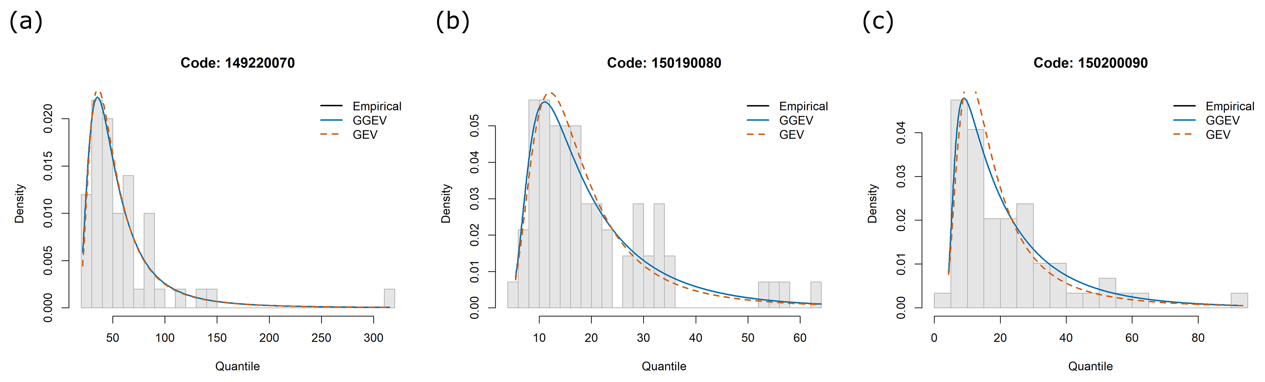 However, some extreme event data do not follow the GEV distribution because they require a more asymmetric distribution or one with a heavier tail. As a result, new classes of probability distributions have been developed that extend beyond the GEV, such as the Dual Gamma GEV (GGEV) (Otiniano et al., 2019) distribution. The GGEV distribution is regarded as highly flexible for several reasons: (1) it introduces an additional parameter that adjusts tail weight and skewness, making it more adaptable to diverse datasets. (2) This added flexibility allows the GGEV to capture the nuances of empirical data more effectively than the standard GEV. (3) Consequently, the GGEV distribution is often preferred in practical applications where accurate modeling of complex data is essential (Nascimento et al., 2015). The additional shape parameter (δ) enables the GGEV distribution to adapt to various data characteristics, especially in terms of tail behavior. Notably, when this parameter is less than 1, the GGEV exhibits a heavier tail than the GEV, making it more effective at modeling extreme events that may occur more frequently than lighter-tailed distributions would predict (Silva and Do Nascimento, 2022).