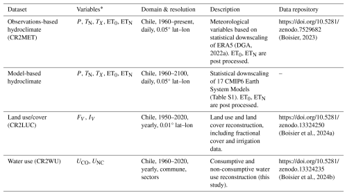 Table S3 in the Supplement provides a full list of sectors, their consumption factors, and the forcing variables and sources. While estimates for LULUCF are computed on a regular grid, water use data is aggregated and reported at the communal scale, with annual estimates from 1960 to 2020. CR2WU data are available at https://doi.org/10.5281/zenodo.13324235 (Boisier et al., 2024b).