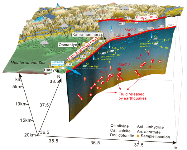 However, the transport of geothermal gas and geothermal water appears to be decoupled. On the one hand, deep geothermal fluid stays deep under the influence of gravity and is less diffusive compared to geothermal gas. On the other hand, the geothermal fluid was diluted due to the infiltration of a large amount of shallow cold water after the 2023 Kahramanmaraş Earthquake Doublet. Our interpretation can explain the lack of deep fluid signal in the groundwater studied in this study. Subsequently, at a depth of 4 km, the gas–water interaction process was experienced. Finally, the gases rose to the surface and were discharged into the atmosphere. Conversely, the circulating groundwater underwent complex water–rock interaction processes, such as anhydrite, calcite, dolomite, anorthite and serpentinization (Fig. 9).