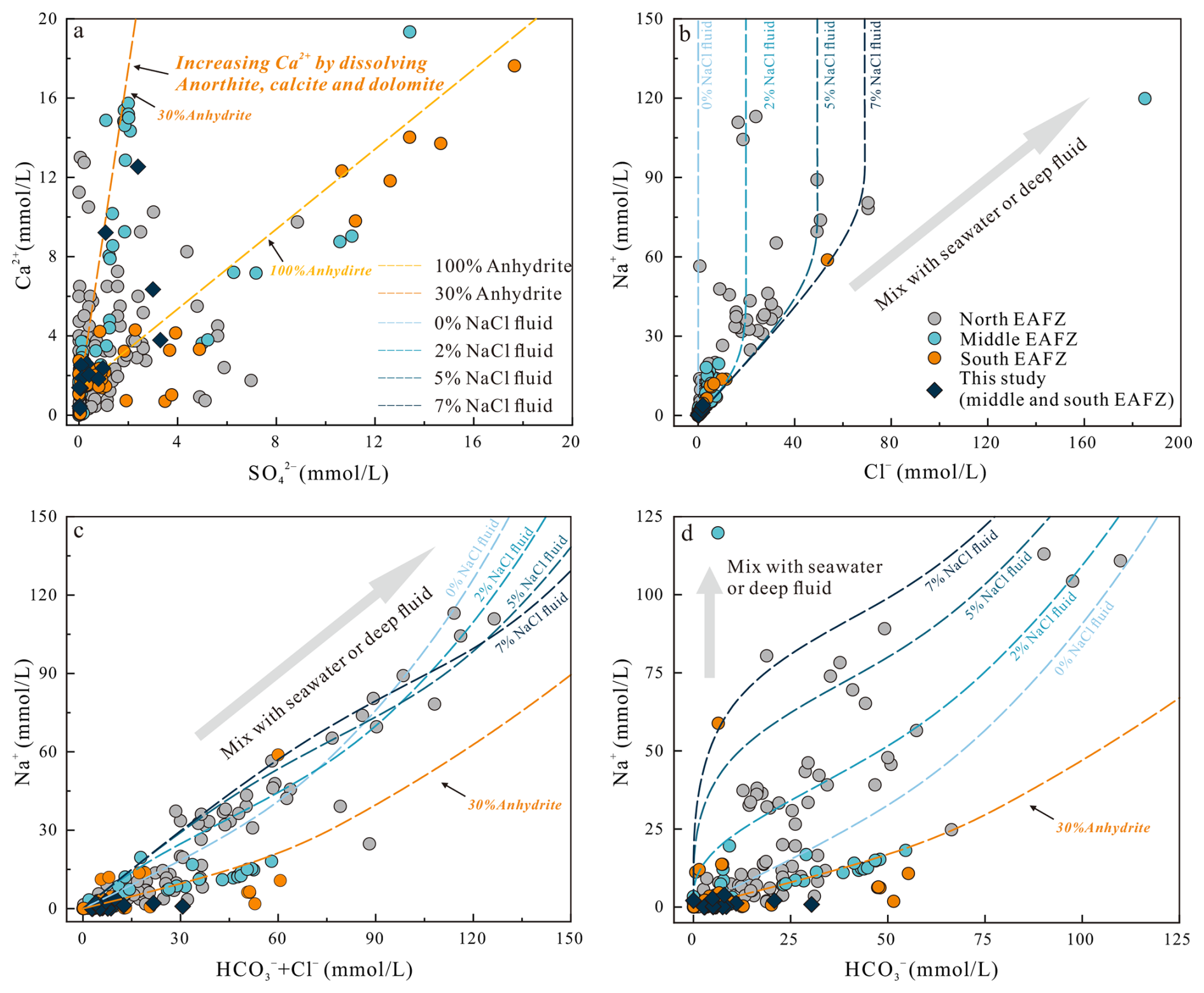 The groundwater chemistry exhibits distinct spatial heterogeneity across the EAFZ segments. Northern groundwater is significantly enriched in Na+, K+ and Cl− (Na–Cl and Na–HCO3 type), whereas central and southern segments display Ca–Mg–HCO3 type waters, with localized Ca–SO4 and Na–Cl anomalies (Fig. 2). These hydrochemical disparities likely reflect fundamentally distinct recharge sources and circulation pathways.