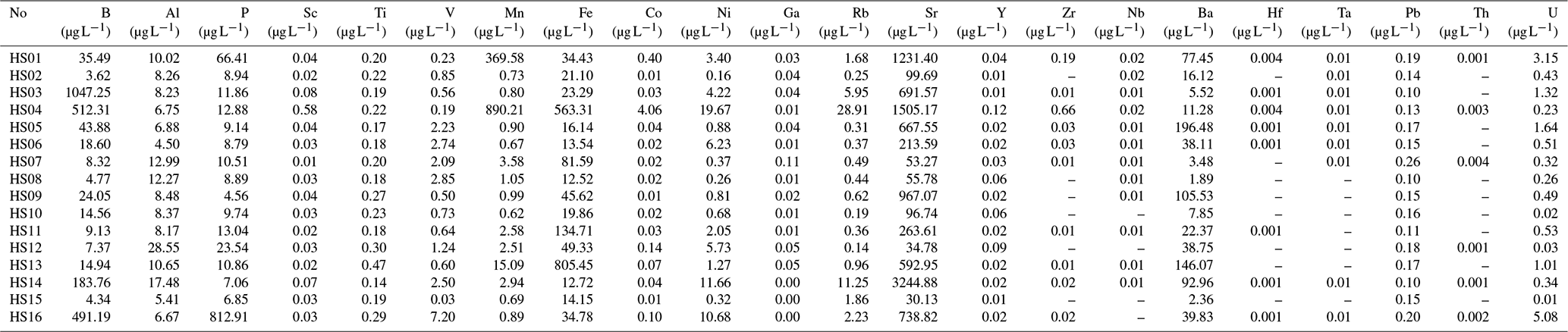 16 samples of groundwater were collected in EAFZ, including hot springs, geothermal wells and river water. HS01–HS04 were collected from west to east along SF. HS07–HS16 were collected from north to south along EAFZ (Fig. 1). Detailed sample collection and testing methods can be found at Luo et al. (2023). In short, the water sample was taken with a 50 mL clean polyethylene bottle, and the temperature and pH of the water were measured and recorded. Two samples were collected at each sampling site: one was added with ultrapure HNO3 to analyze the cation content, and the other was used to analyze the anion content and isotopic composition. All samples needed to be pre-treated with a 0.45 µm filter membrane to remove impurities before sampling.