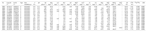 The hydrogen and oxygen isotopes were determined by a Picarro L2140-I liquid water and vapor isotope analyzer (relative to Vienna Standard Mean Ocean Water (VSMOW)). Precision on the measured δ18O and δD value was ±0.2 % (2 SD) and ±1 % (2 SD) respectively (Zeng et al., 2025). The cations (Li+, Na+, K+, Ca2+ and Mg2+) and anions (F−, Cl−, NO and SO) were analyzed by a Dionex ICS-900 ion chromatograph (Thermo Fisher Scientific Inc.) at the Earthquake Forecasting Key Laboratory of the China Earthquake Administration, with the reproducibility within ±2 % and a detection limit of 0.01 mg L−1 (Chen et al., 2015). HCO and CO were determined by acid–base titration with a ZDJ-100 potentiometric titrator (reproducibility within ±2 %). SiO2 was analyzed by an inductively coupled plasma emission spectrometer Optima-5300 DV (PerkinElmer Inc.) (Li et al., 2021). Trace elements were analyzed by Element XR ICP-MS at the Test Center of the Research Institute of Uranium Geology. Multielement standard solutions (IV-ICPMS 71A, IV-ICP-MS 71B and IV-ICP-MS 71D, Inorganic Ventures) were used for quality control. The analytical error margin of major cations and trace elements was less than 10 %. Strontium isotope ratios () were determined through triple quadrupole ICP-MS (Agilent 8900 ICP-QQQ) with a precision of ±0.001 (Liu et al., 2020).