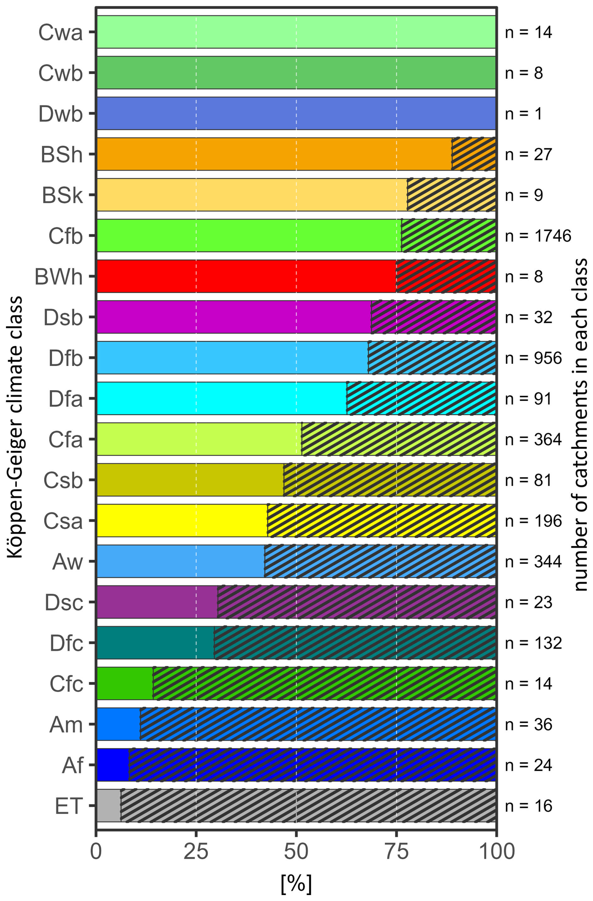 Figure 7Significance of the P−E0 synchronicity anomalies by Köppen climate class: the dashed area represents the proportion of catchments for which synchronicity was not deemed significant.