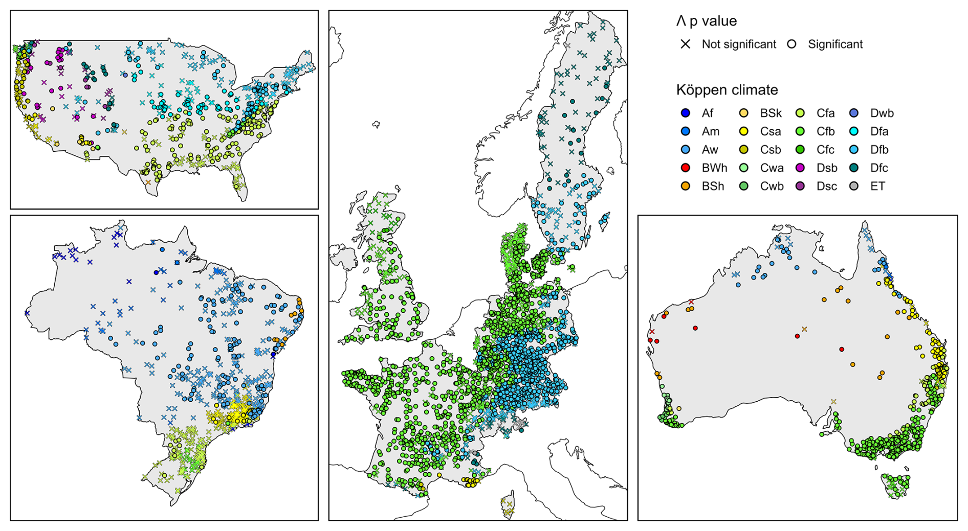 In Fig. 7, we summarize the significance of the coefficient across all the Köppen climate classes represented in our dataset: is significant at the 0.05 level for 50 % of the catchments in 11 classes (representing 79 % of the catchments).