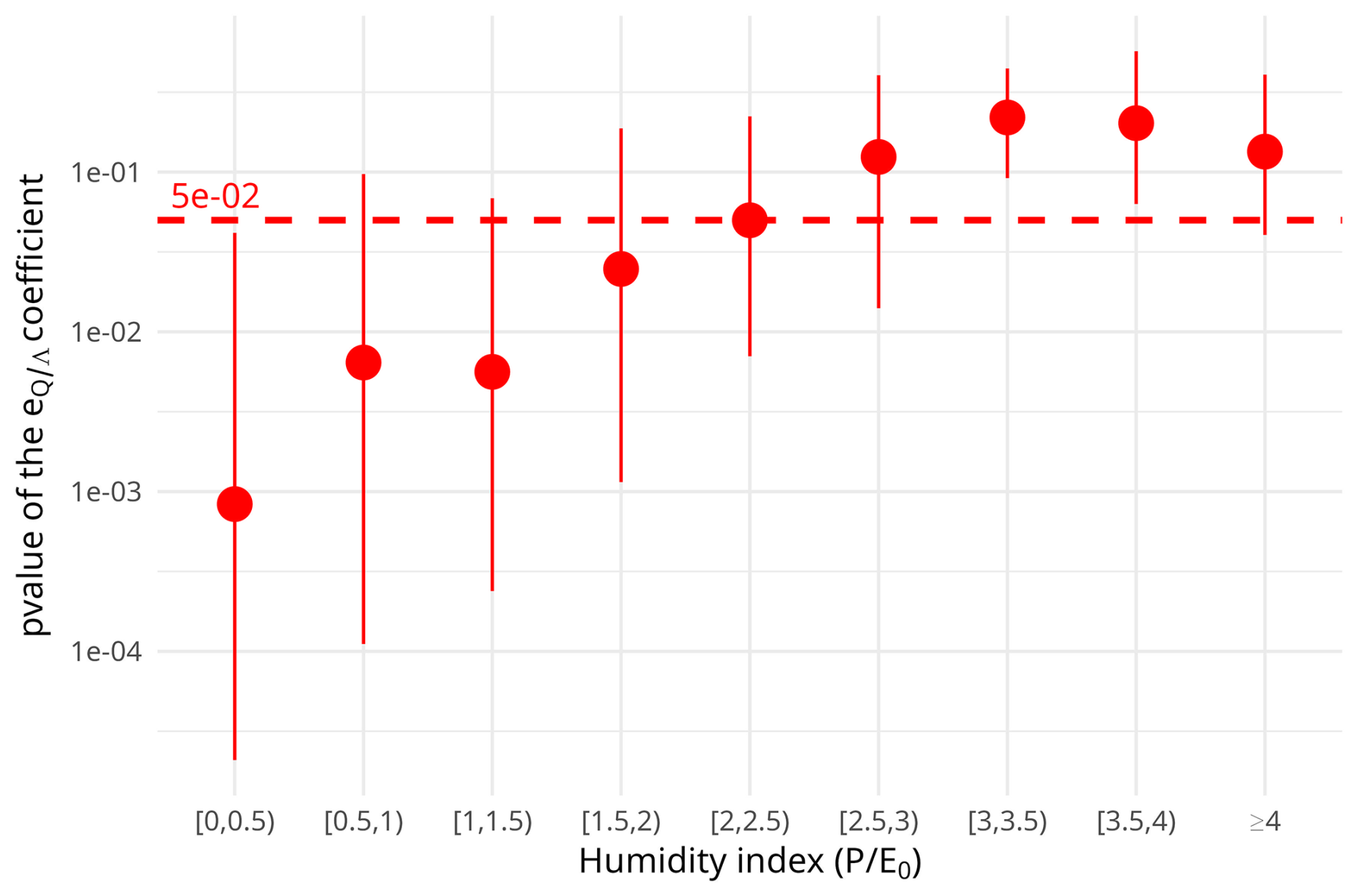 To verify this hypothesis, Fig. 9 presents the p-values of the 4122 eQ.Λ coefficients as a function of the humidity index . This graph clearly indicates that most of the humid catchments (Humidity index > 2) lack sensitivity to the P−E0 seasonality, and this pattern is likely the main explanation for the geographical patterns observed in Fig. 8.