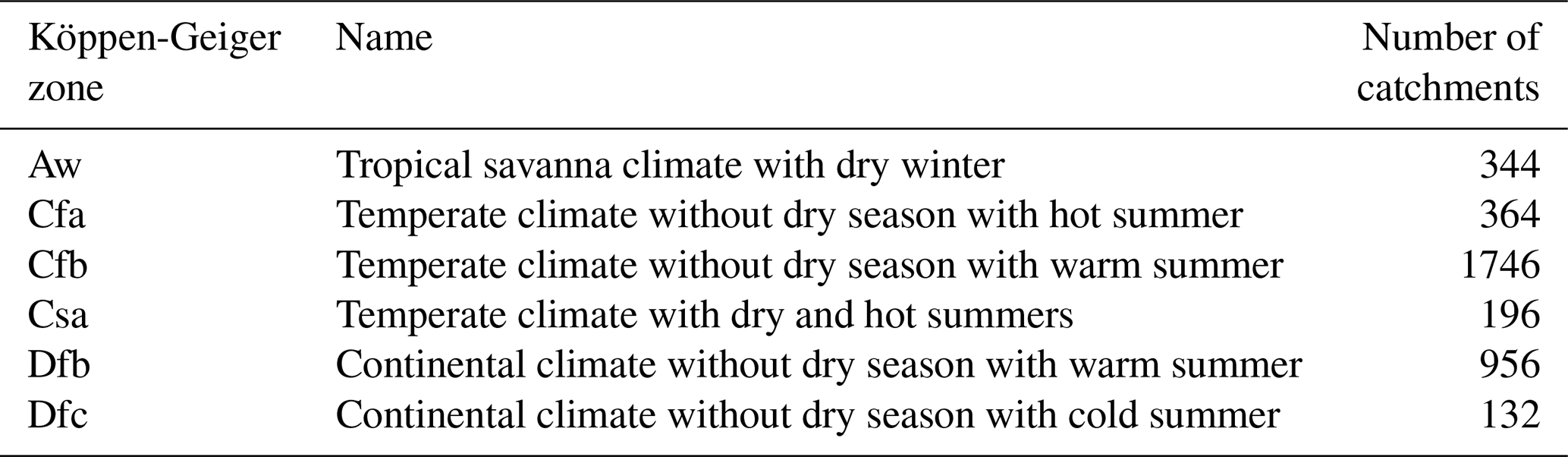 Table 2Main climatic zones (in the sense of the Köppen-Geiger classification) represented in our dataset (we present the zones counting more than 100 catchments).