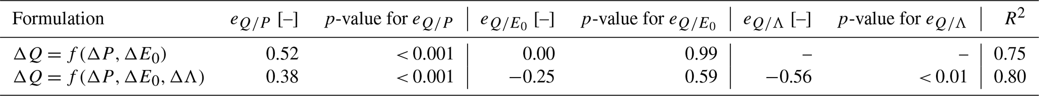 S1 was an interesting solution because it yielded directly a value in mm yr−1, without the need for rescaling, and it clearly represented the precipitation volume that was the most easily accessible to evaporation. In the linear regression, it did give very high average adjusted R2 (world average of 0.67, the same as for the solution retained). The reason why we did not consider this solution was that there was a correlation between ΔS1 and ΔP for many catchments (average correlation of +0.58 over the 4122 catchments, reaching +0.74 over the Australian catchments), and introducing two correlated variables in a regression equation is clearly bad statistical practice.