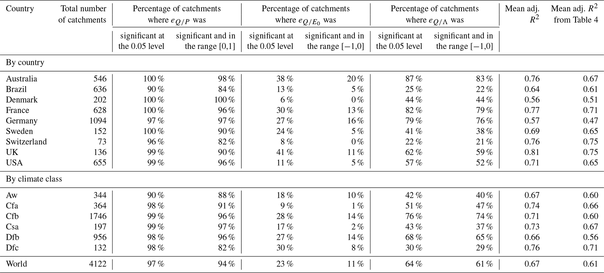Table 5 presents the same statistics, when the synchronicity anomaly (ΔΛn) is introduced into the elasticity regression (Eq. 7). This analysis shows that the average efficiency of the regression equation increases across all countries and climate groups (see also Fig. 6). While an increase is expected when an additional predictor is added to a regression, please note that we are presenting adjusted R2 values, which are designed to take that issue into account. The average additional explained variance lies in the range 3 %–10 % (6 % globally), depending on the group, and we consider it a noticeable improvement. Additionally, the synchronicity anomaly (ΔΛn) provides a significant contribution to the regression for 64 % of the catchments, compared to only 23 % for potential evaporation).