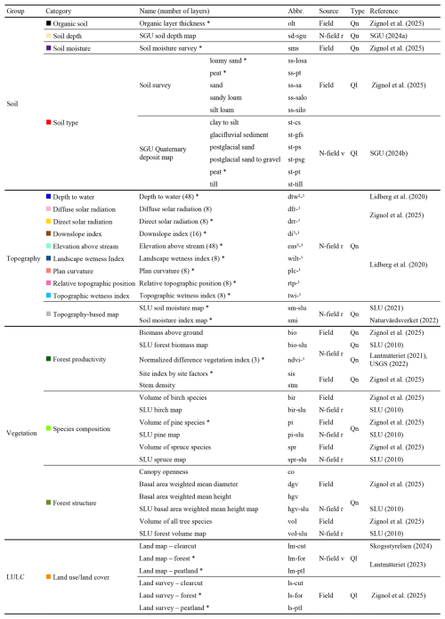 Table 1All predictors of soil moisture spatial variability evaluated in this study. The 48 predictors are subdivided into four groups and 18 color-coded categories, listed in alphabetical order within each group and category based on the abbreviation code (“Abbr.” column). The table also displays the data source (field, non-field raster (N-field r), non-field vector (N-field v)), data type (qualitative (Ql) vs. quantitative (Qn)), and references. Each class of the qualitative variables is considered to be a distinct predictor in the analysis. The number of layers of the topographic and vegetation indices is reported in parenthesis after the predictor name, and it depends on the following: 1 the spatial resolutions (0.5, 1, 2, 4, 8, 16, 32, and 64 m for the topographic indices and 0.4, 2, and 30 m for NDVI), 2 the stream initiation thresholds (1, 2, 4, 8, 16, and 32 ha for depth to water and elevation above stream), and 3 the vertical distances (2 and 4 m for the downslope index). An asterisk denotes the 22 most relevant soil moisture predictors, which are displayed in Fig. 3. The 26 remaining predictors (without an asterisk) are shown in Fig. S2. The Supplement provides a detailed description of each variable listed in this table.