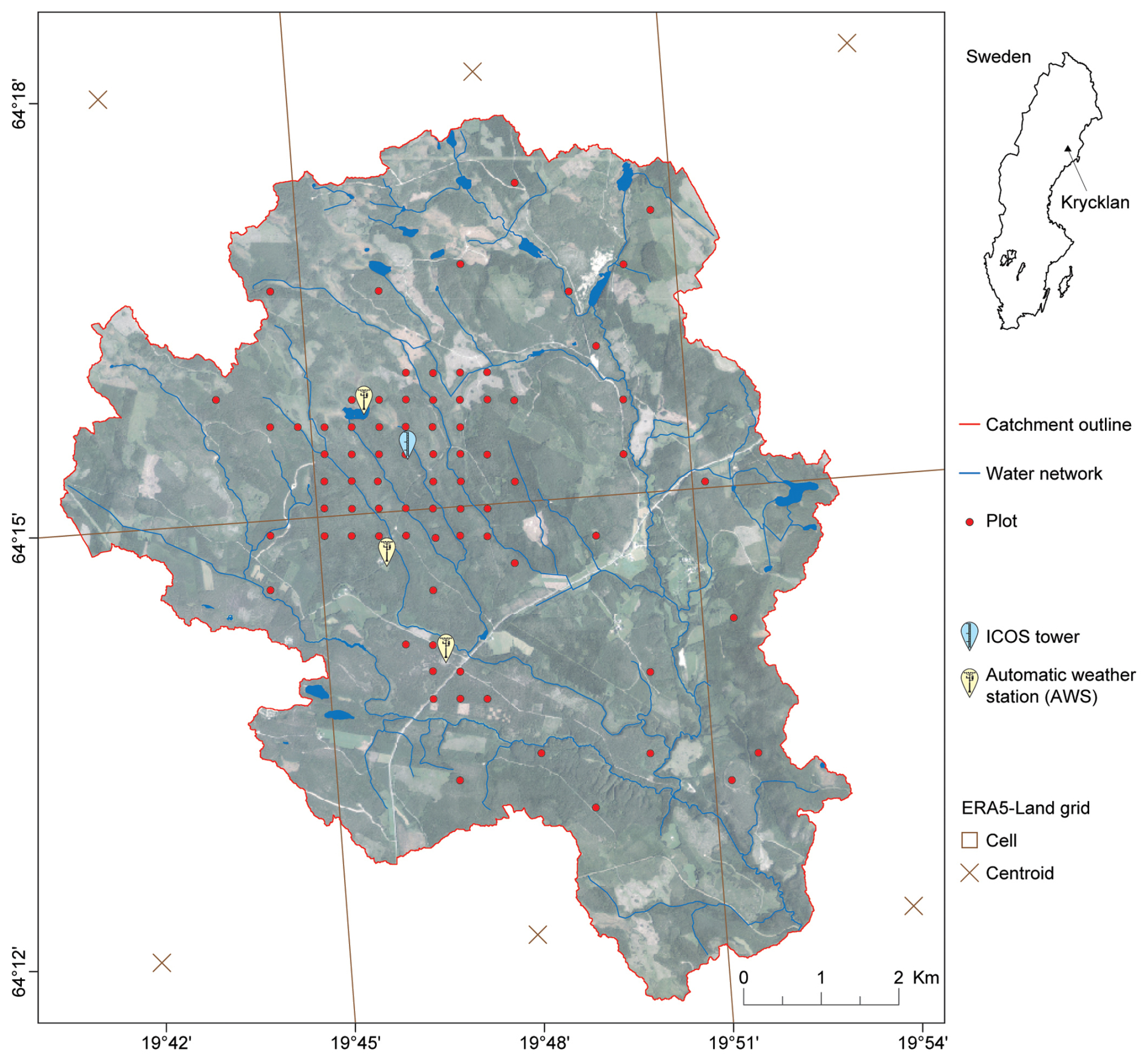 Since the 1980s, the Krycklan catchment has supported research on ecosystem dynamics and forest management with high-quality, long-term climatic, biogeochemical, hydrological, and environmental measurements, making it a unique field infrastructure in boreal forest landscapes (Laudon et al., 2013). It features 11 gauged streams, around 1000 soil lysimeters, 150 groundwater wells, over 500 permanent forest inventory plots, three automatic weather stations (Fig. 1), and a 150 m tall ICOS (Integrated Carbon Observation System) tower (Fig. 1) for measuring atmospheric gas concentrations and biosphere–atmosphere exchanges of carbon, water, and energy (Laudon et al., 2021). Additionally, high-resolution multi-spectral lidar measurements and large-scale experiments have been conducted in the Krycklan catchment over the past decade.