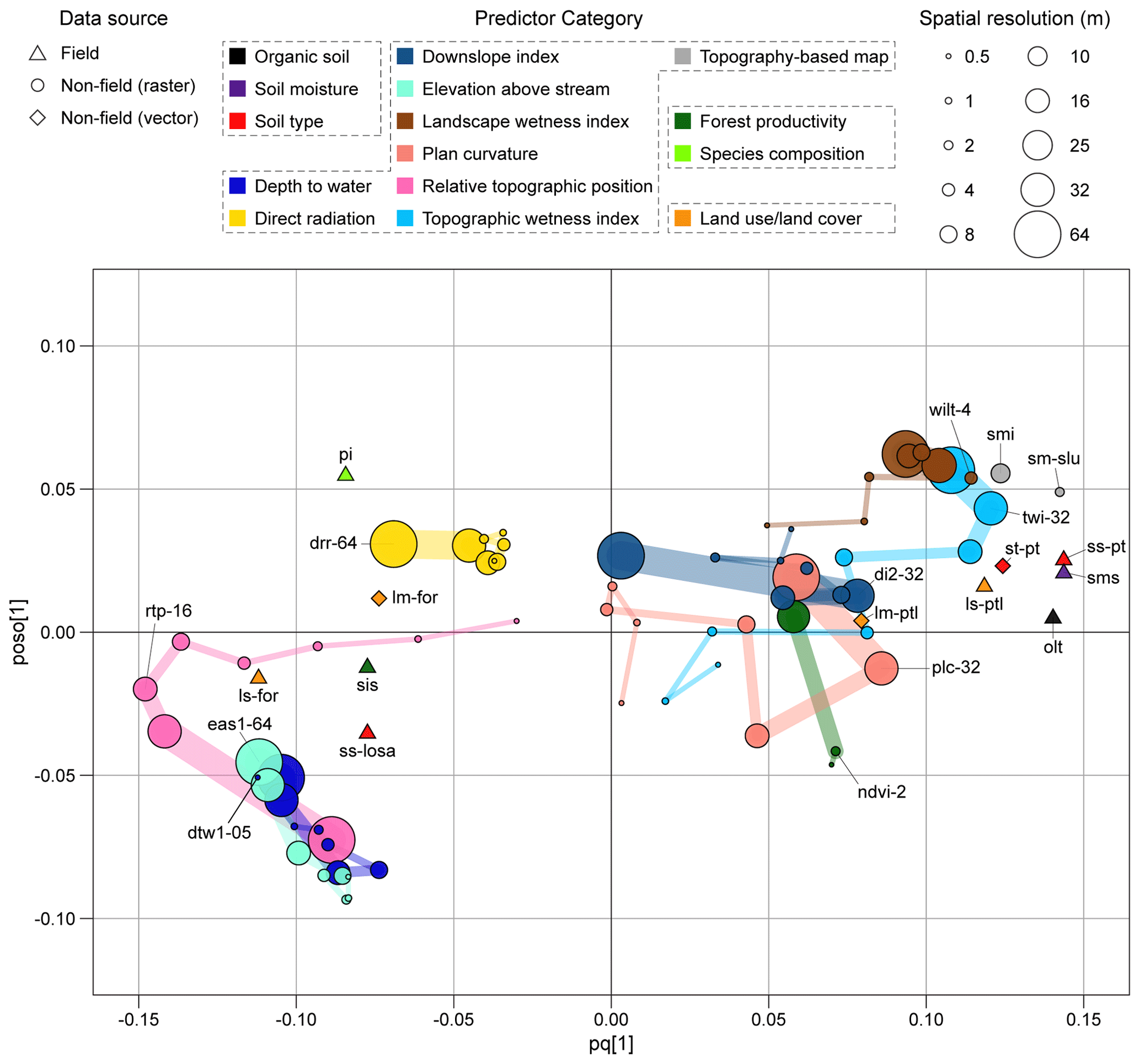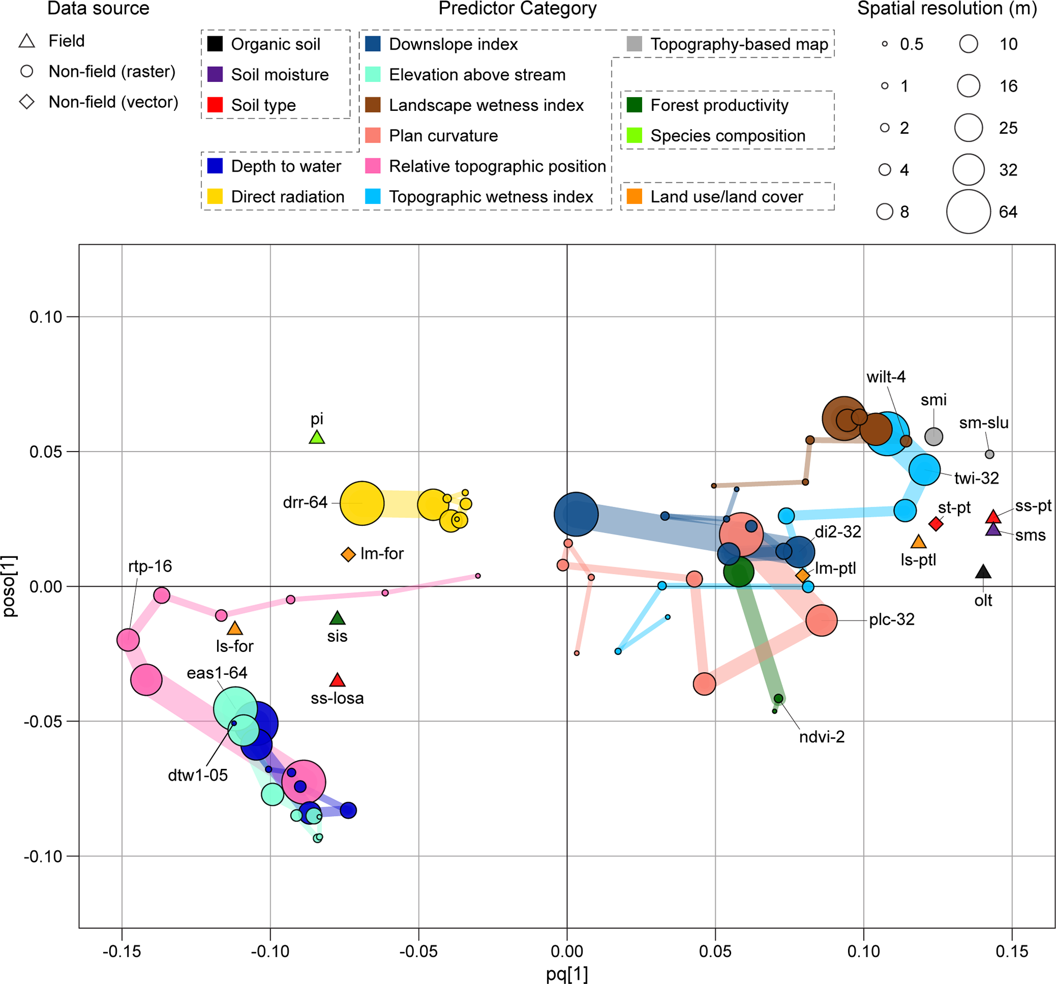 Figure 3OPLS loading plot showing the relationship between a large array of “spatial” predictors, which vary spatially but remain constant over time, and the mean seasonal soil moisture (5 July–4 October 2022). Both the spatial predictors (X variables) and the response variable (Y variable) were gathered for 78 sites across the Krycklan catchment (Fig. 1 for the site locations). The spatial predictors, overall describing soil, topography, vegetation, and land use/land cover at each site (gray dotted boxes in the figure legend), were either directly measured in situ (symbolized by triangles) or estimated through remote sensing or modeling techniques (depicted as circles or rhombuses depending on the dataset format). These predictors were organized into 18 color-coded categories (see Table 1; here only 15 are shown) to enhance plot readability. Gridded (i.e., raster) predictors are characterized by a certain spatial resolution (expressed in meters, representing the length of the grid cell side), which is proportional to the size of the circles. To visualize the effects of spatial resolution, guides connect loadings of the same variable moving from high to low resolutions, with the variable name visible only in correspondence to the optimal resolution (refer to Table 1 for variable labels). High positive and negative loadings on the predictive axis (pq[1]) represent variables that are positively and negatively correlated with the response variable (Y), with stronger correlation further away from the origin. The orthogonal axis (poso[1]) indicates how much of the variation for each variable was not correlated with the response variable (Y). This figure only shows the 22 most relevant predictors (VIPpredictive greater than 1, marked by an asterisk in Table 1). If multiple user-defined thresholds were tested for a certain topographic index (i.e., depth to water, downslope index, and elevation above stream), the plot displays only the best-performing one. All 26 remaining variables are included in Fig. S2.