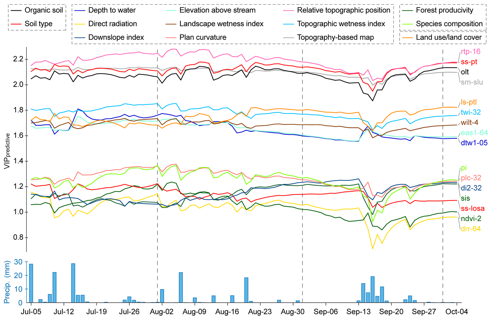 Most predictors experienced abrupt drops in VIPpredictive during intense and/or multi-day precipitation occurrences (e.g., 16 September) (Fig. 5), when the soil moisture variability across all 78 sites was also at its lowest (bottom graphic in Fig. 2c). However, some topographic indices (dtw1-05, eas1-64, and, to a lesser degree, plc-32 and rpt-16) showed increasing predictive power after the beginning of a precipitation event (e.g., July 15 or September 15) (Fig. 5). During drying periods (e.g., between late August and almost mid-September), the VIPpredictive values of the majority of predictors tended to steadily and slowly decrease, except for three notable exceptions: the loamy sand soil class (ss-losa), the site index by site factors (sis), and the downslope index (di2-32).