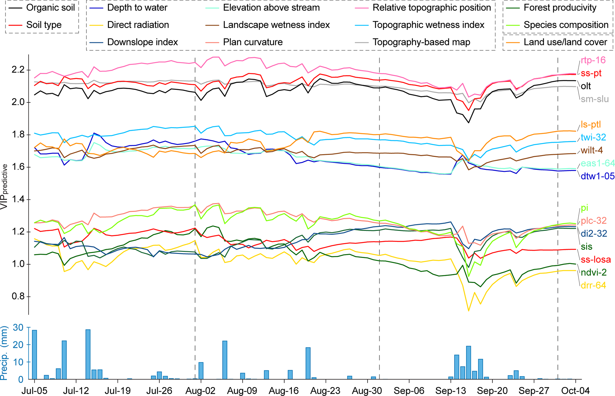 Figure 5VIPpredictive values of 92 spatial OPLS models generated using mean daily soil moisture over the study season (5 July–4 October 2022) as the response variable (Y). The lower section of the figure displays the mean precipitation across Krycklan derived from weather stations (refer to Fig. 1 for their locations). The spatial predictors, overall describing soil, topography, vegetation, and land use/land cover at each site (gray dotted boxes in the figure legend), were organized into 18 color-coded categories (see Table 1; here only 14 are shown) to enhance plot readability. Color-coded labels on the right side of the figure are ordered according to their VIPpredictive on the last day of the study season (4 October 2022). To avoid clutter and highlight the key findings, only a subset of predictors is presented, but a graphic with all 22 relevant predictors (VIPpredictive greater than 1) displayed in Fig. 3 is included in Fig. S4.